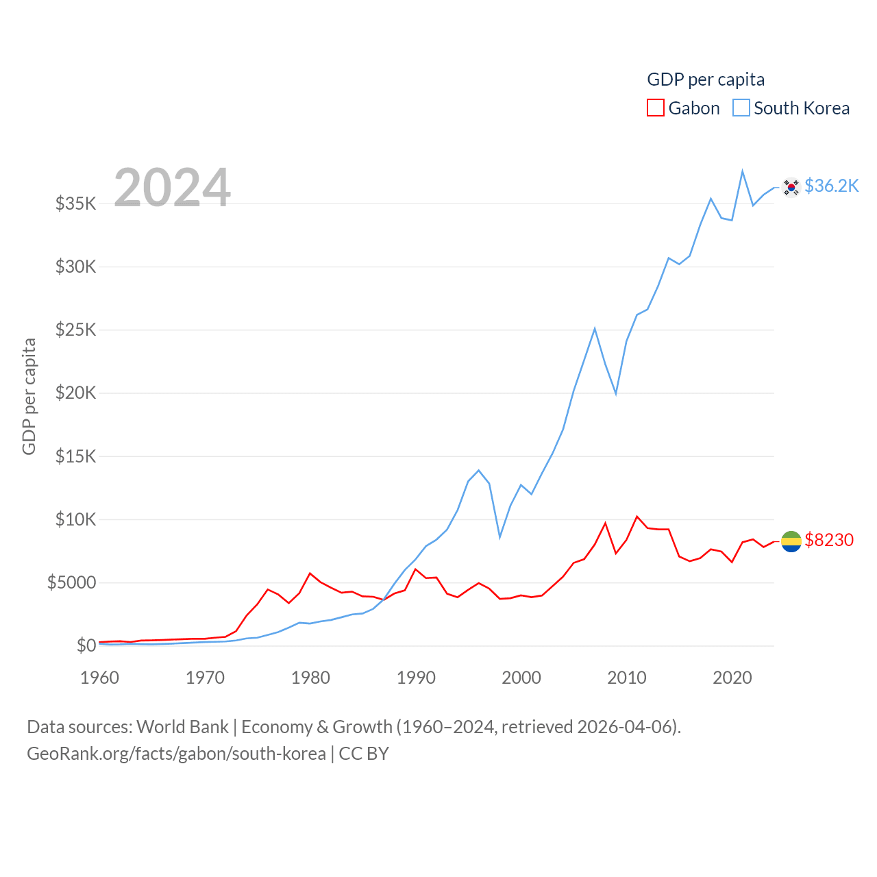 By GDP, Gabon ranks 127/197 ($20.9B) and South Korea ranks 12/197 ($1.88T). By GDP per capita, Gabon ranks 93/197 ($8,230), while South Korea ranks 31/197 ($36,239).