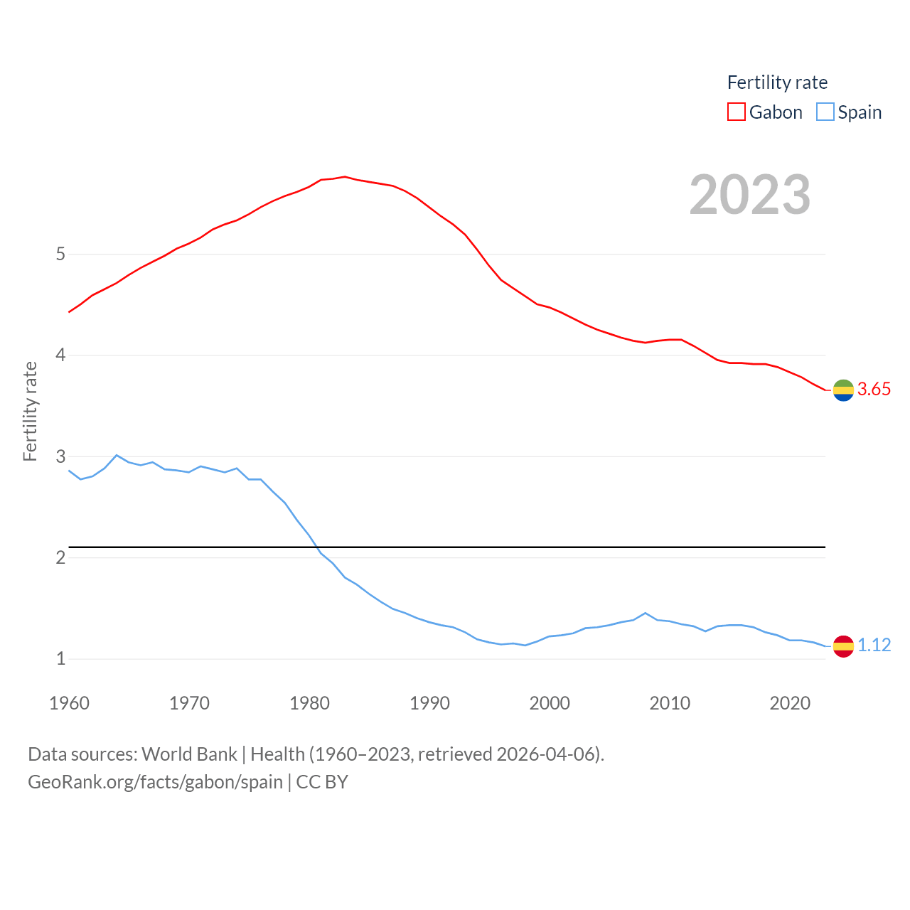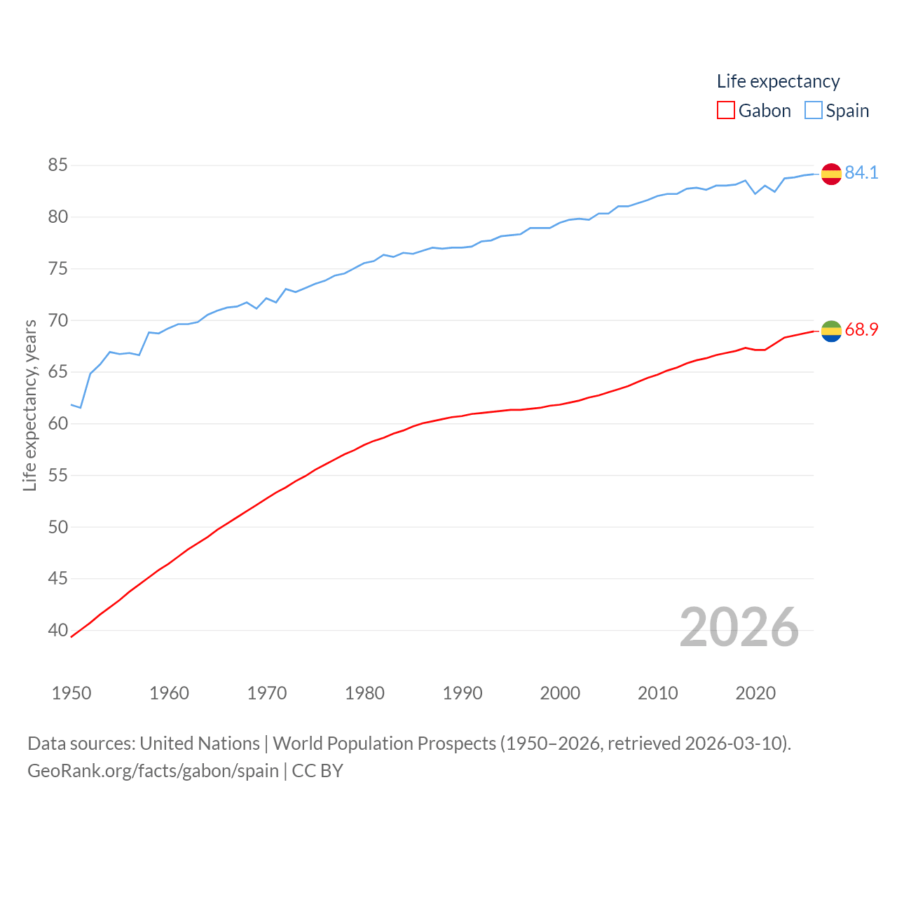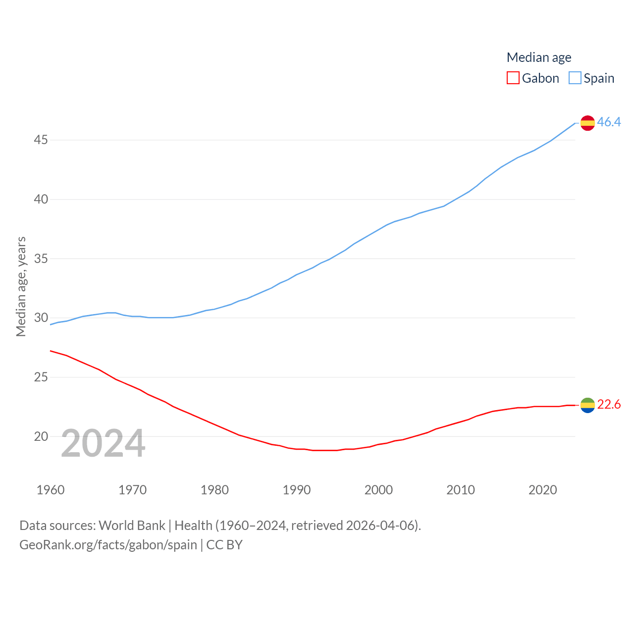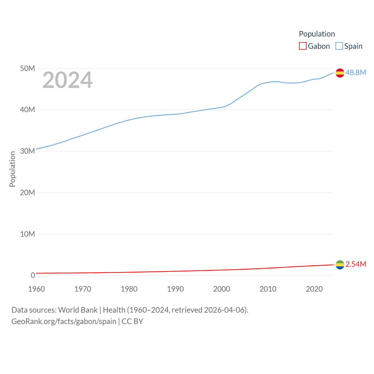 Gabon has a population of 2.54M (ranked 141/197), compared with 48.8M in Spain (ranked 32/197). Gabon's land area is 99,487 sq mi versus 192,934 sq mi for Spain (ranked 75th vs. 51st).