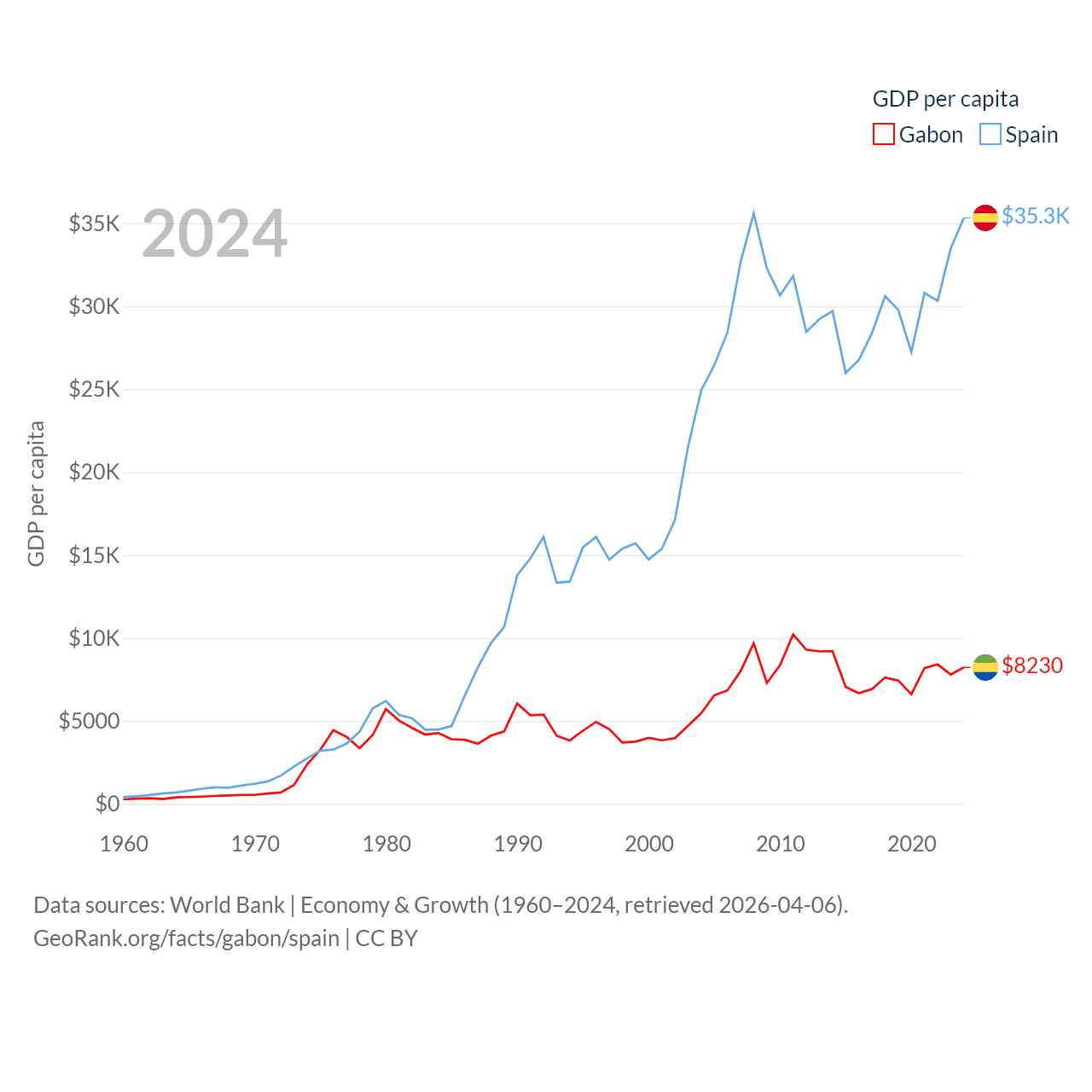 By GDP, Gabon ranks 127/197 ($20.9B) and Spain ranks 15/197 ($1.73T). By GDP per capita, Gabon ranks 93/197 ($8,230), while Spain ranks 32/197 ($35,327).