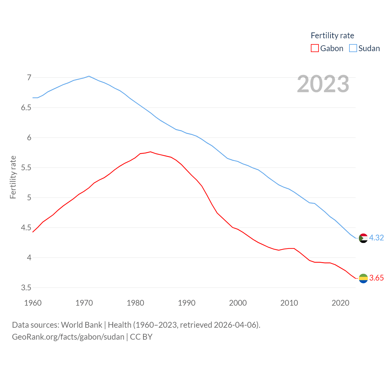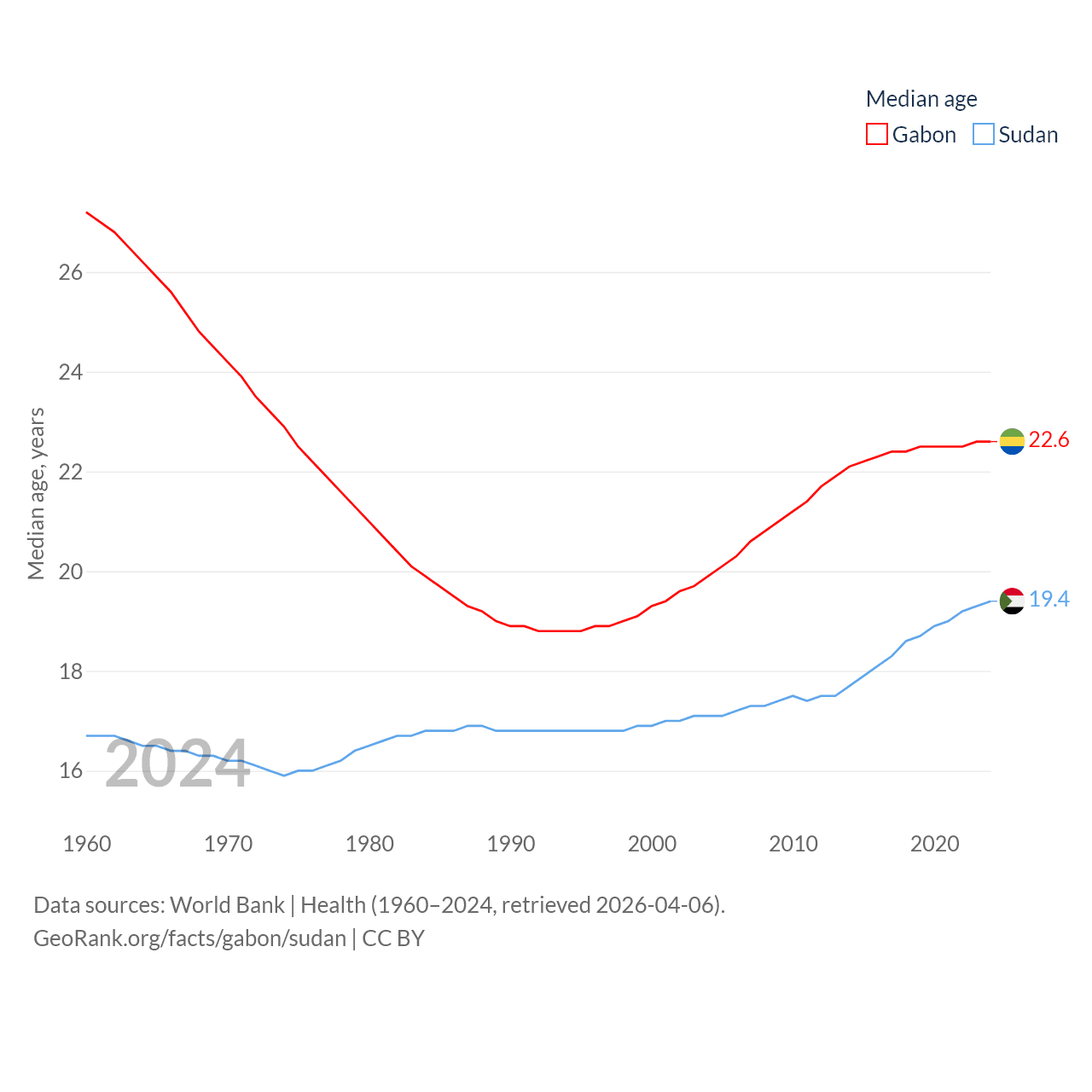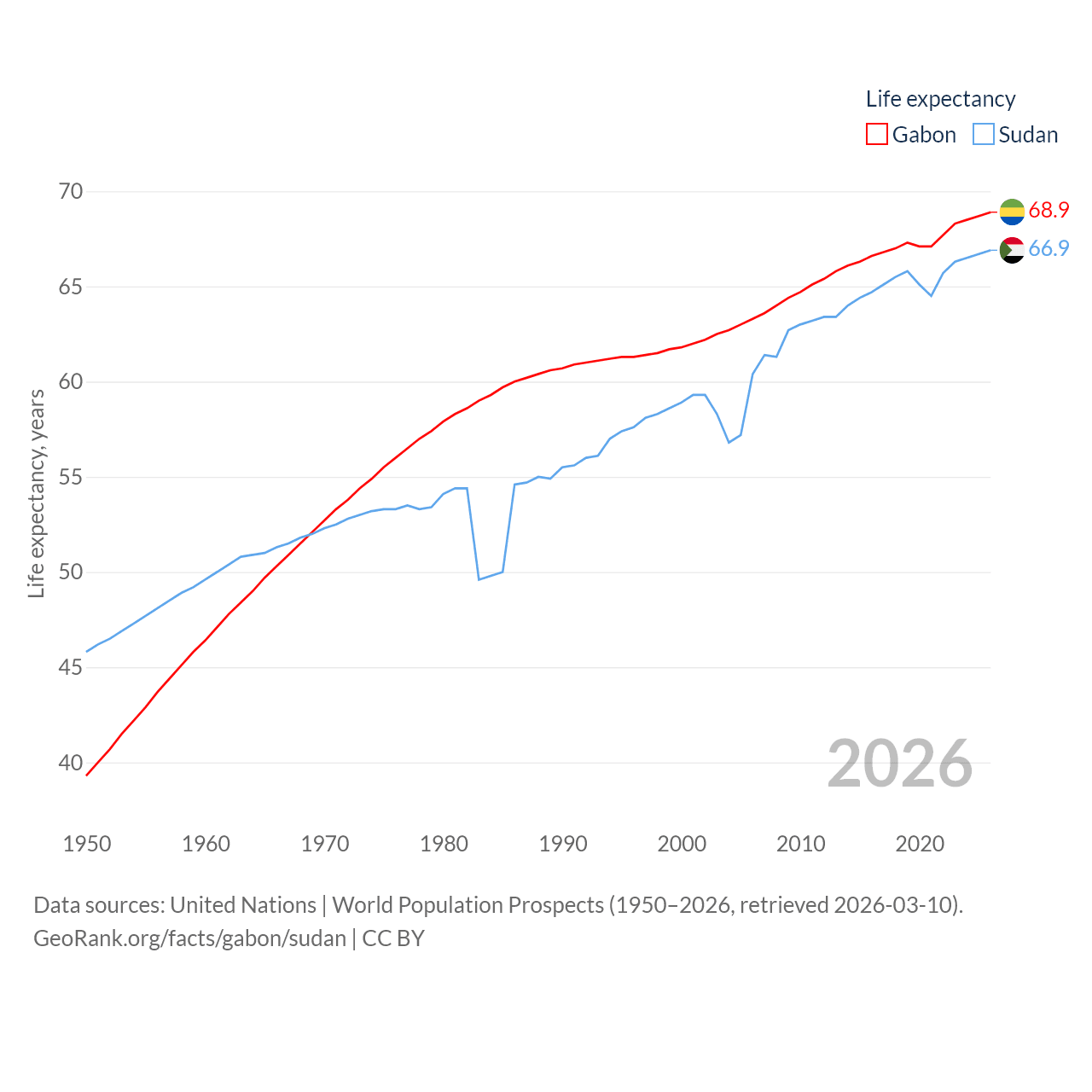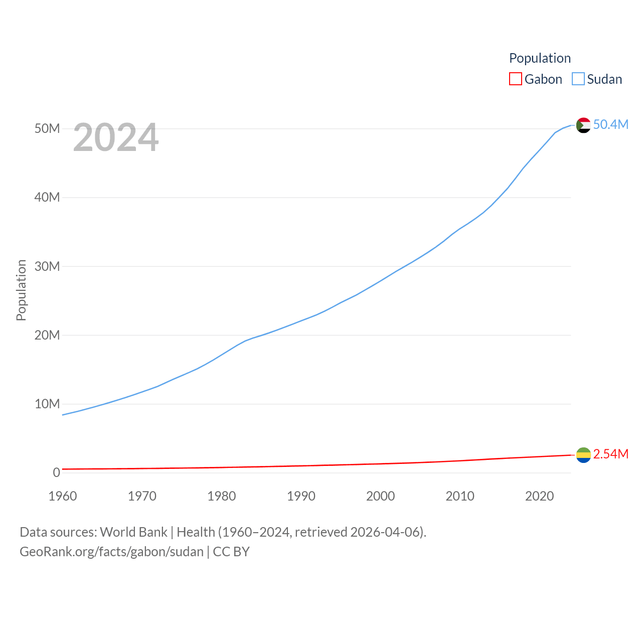 Gabon has a population of 2.54M (ranked 141/197), compared with 50.4M in Sudan (ranked 30/197). Gabon's land area is 99,487 sq mi versus 721,239 sq mi for Sudan (ranked 75th vs. 15th).