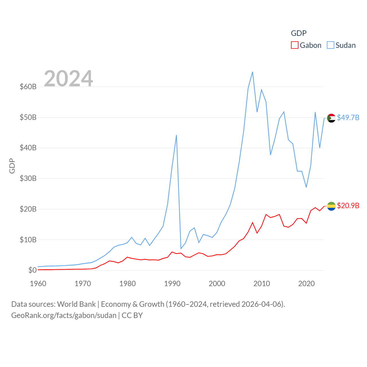 By GDP, Gabon ranks 127/197 ($20.9B) and Sudan ranks 94/197 ($49.7B). By GDP per capita, Gabon ranks 93/197 ($8,230), while Sudan ranks 179/197 ($985).