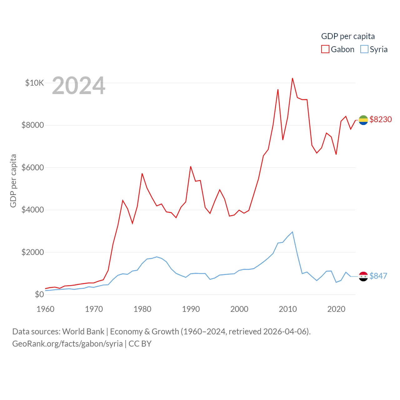 By GDP, Gabon ranks 127/197 ($20.9B) and Syria ranks 129/197 ($20B). By GDP per capita, Gabon ranks 93/197 ($8,230), while Syria ranks 185/197 ($847).