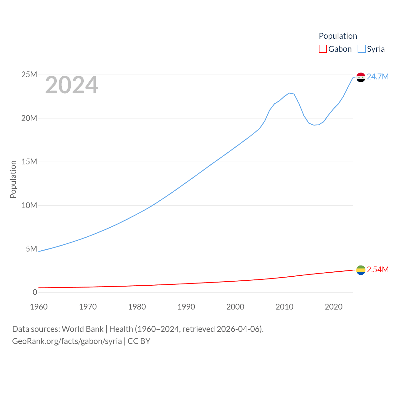 Gabon has a population of 2.54M (ranked 141/197), compared with 24.7M in Syria (ranked 57/197). Gabon's land area is 99,487 sq mi versus 70,900 sq mi for Syria (ranked 75th vs. 87th).