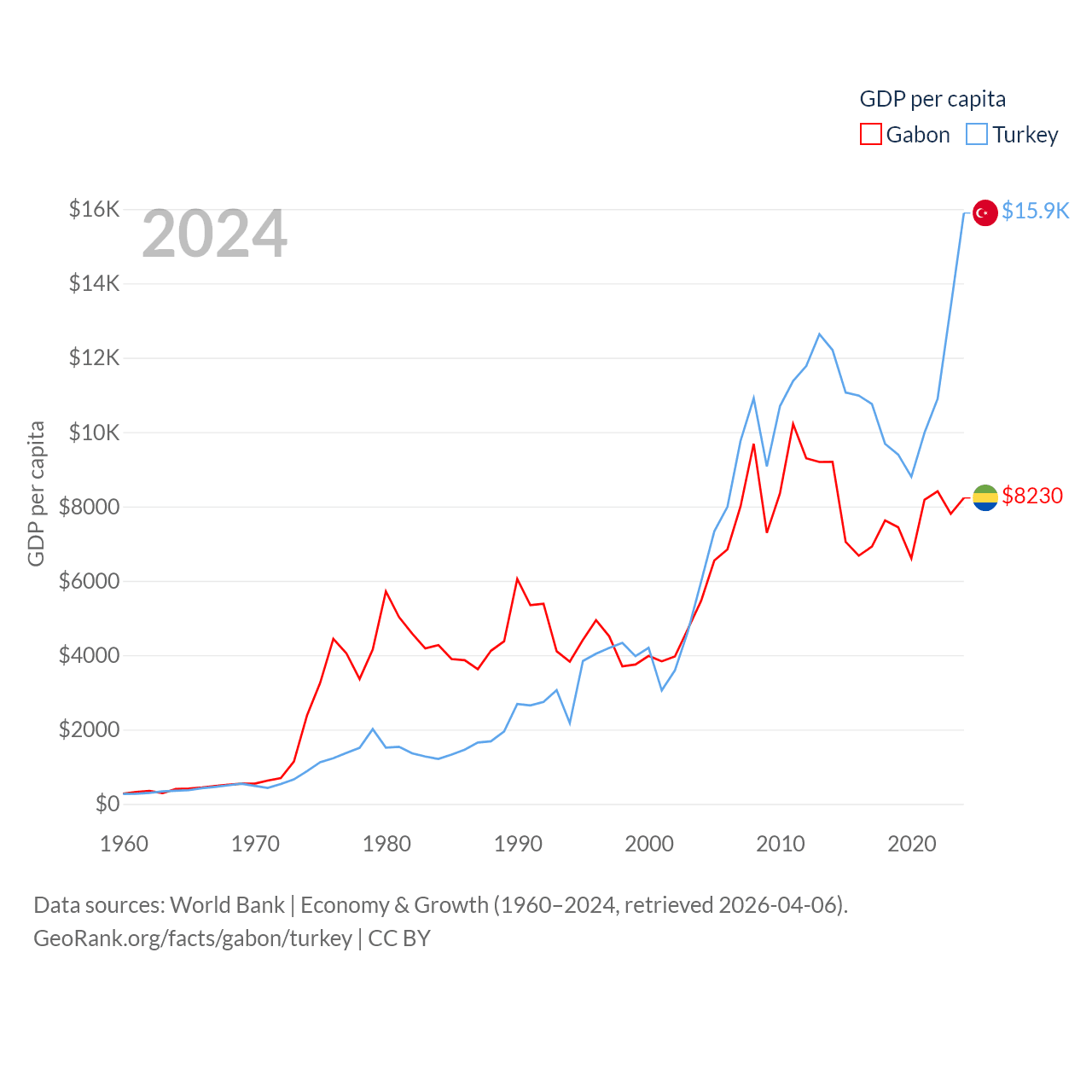 By GDP, Gabon ranks 127/197 ($20.9B) and Turkey ranks 17/197 ($1.36T). By GDP per capita, Gabon ranks 93/197 ($8,230), while Turkey ranks 66/197 ($15,893).