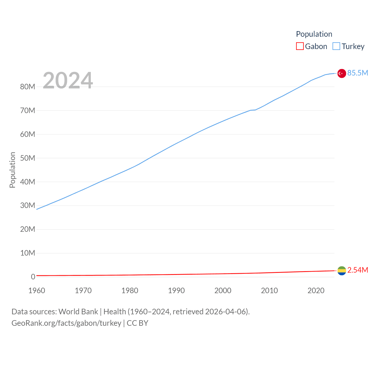 Gabon has a population of 2.54M (ranked 141/197), compared with 85.5M in Turkey (ranked 18/197). Gabon's land area is 99,487 sq mi versus 297,156 sq mi for Turkey (ranked 75th vs. 36th).