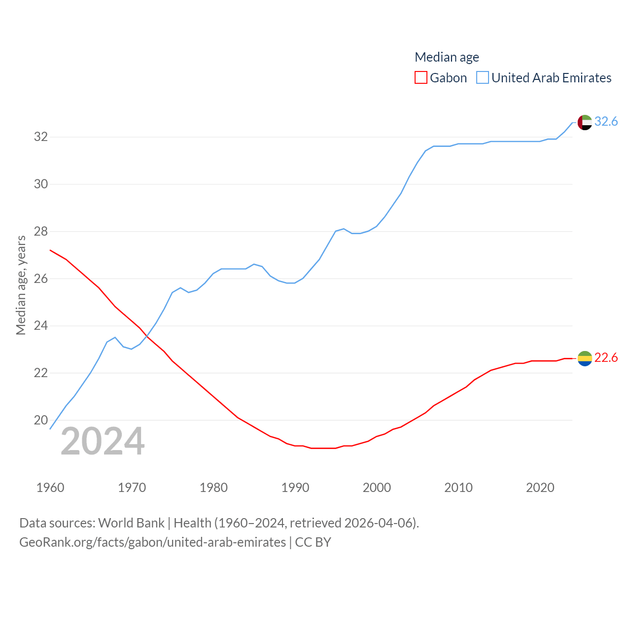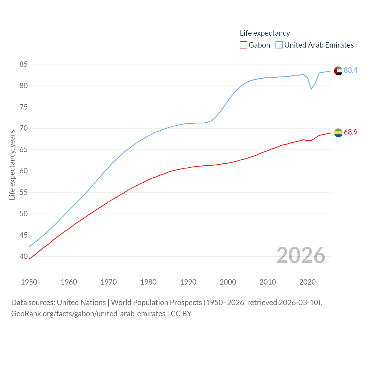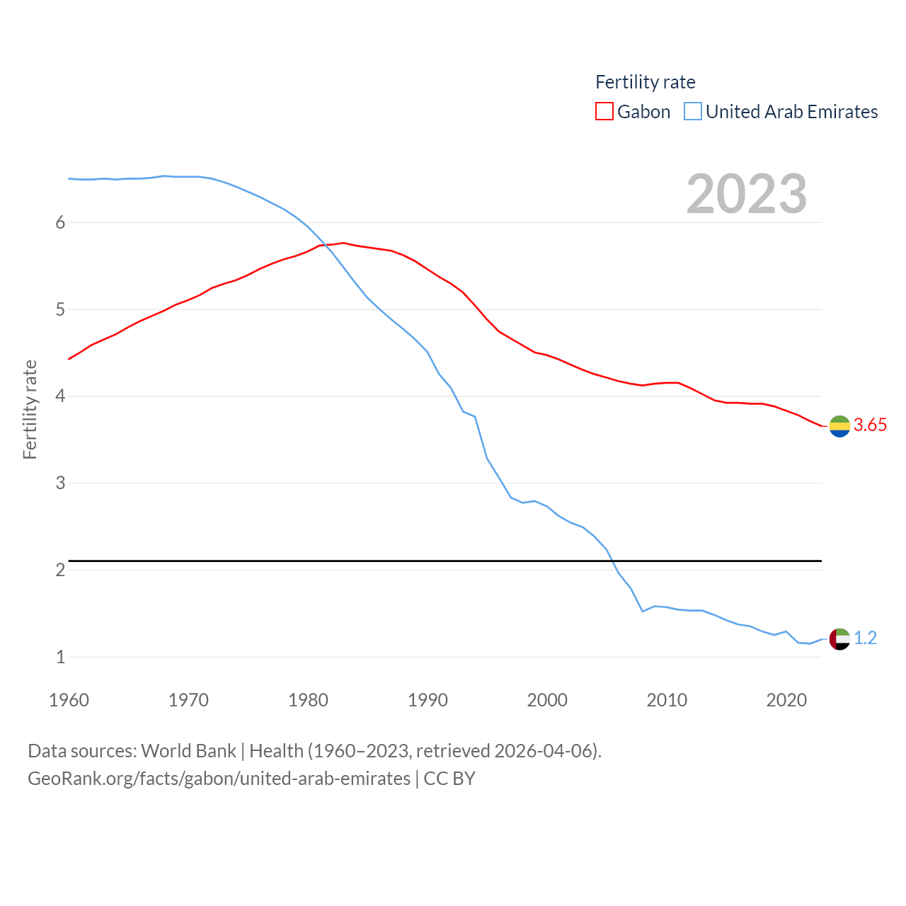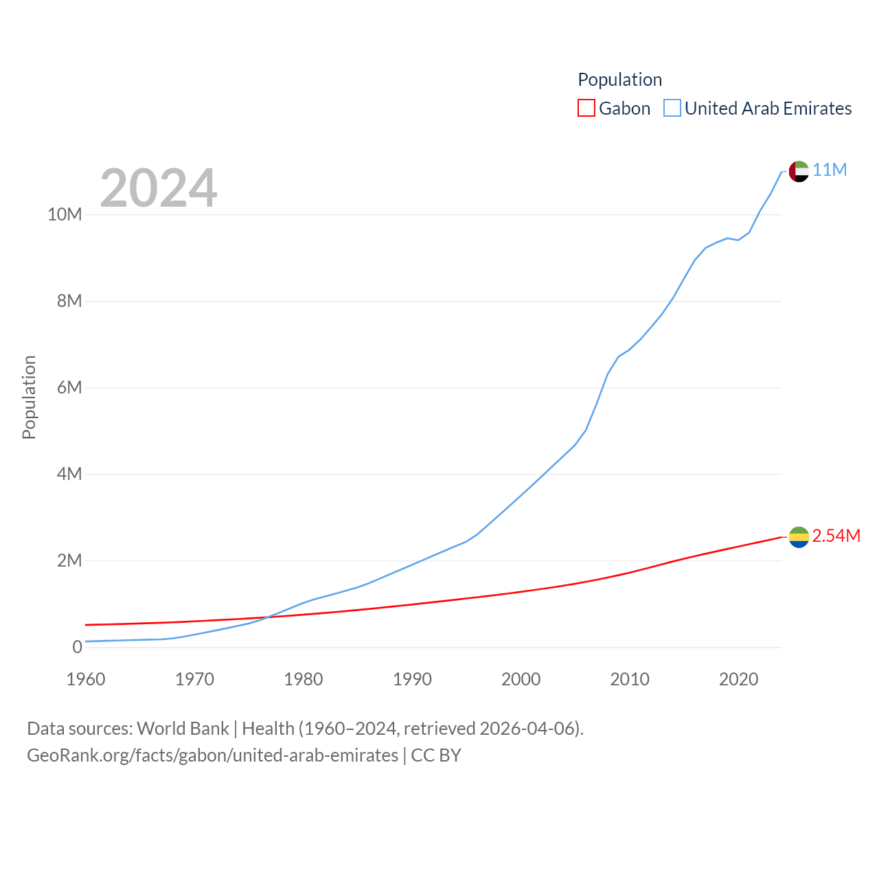 Gabon has a population of 2.54M (ranked 141/197), compared with 11M in The United Arab Emirates (ranked 86/197). Gabon's land area is 99,487 sq mi versus 27,421 sq mi for The United Arab Emirates (ranked 75th vs. 117th).