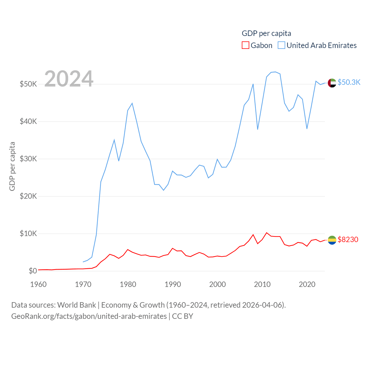 By GDP, Gabon ranks 127/197 ($20.9B) and The United Arab Emirates ranks 27/197 ($552B). By GDP per capita, Gabon ranks 93/197 ($8,230), while The United Arab Emirates ranks 24/197 ($50,274).