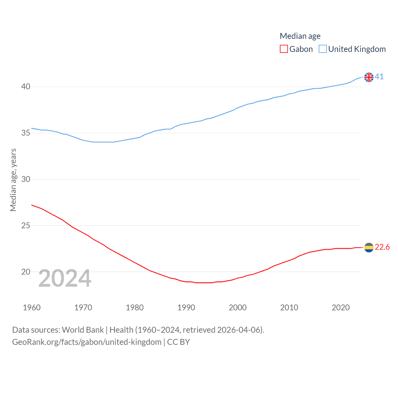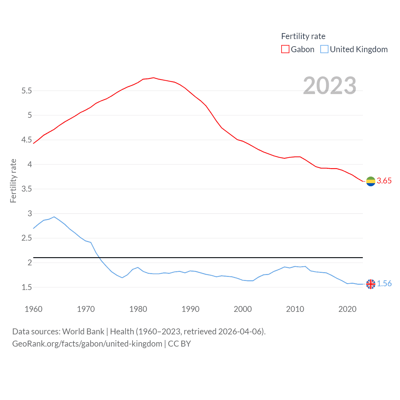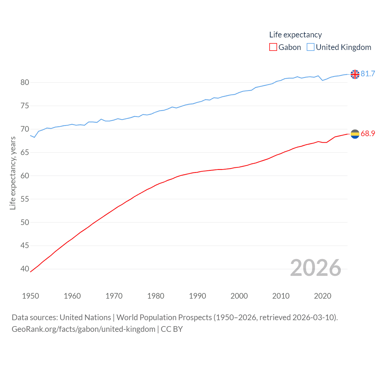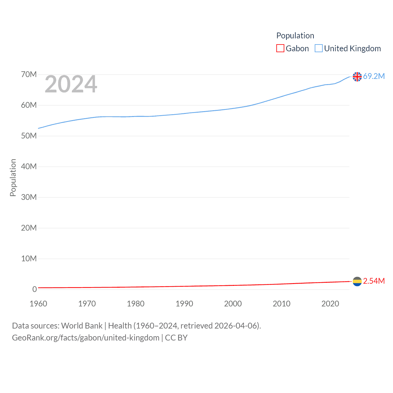 Gabon has a population of 2.54M (ranked 141/197), compared with 69.2M in The United Kingdom (ranked 21/197). Gabon's land area is 99,487 sq mi versus 93,410 sq mi for The United Kingdom (ranked 75th vs. 78th).