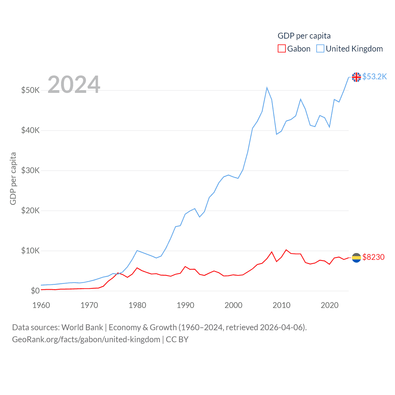 By GDP, Gabon ranks 127/197 ($20.9B) and The United Kingdom ranks 6/197 ($3.69T). By GDP per capita, Gabon ranks 93/197 ($8,230), while The United Kingdom ranks 22/197 ($53,246).