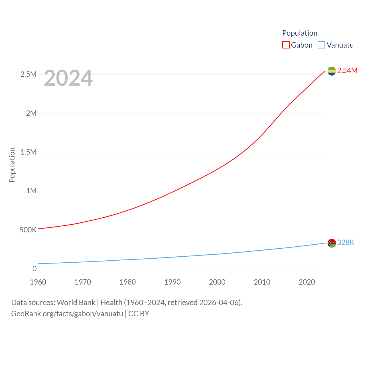 Gabon has a population of 2.54M (ranked 141/197), compared with 328K in Vanuatu (ranked 174/197). Gabon's land area is 99,487 sq mi versus 4,707 sq mi for Vanuatu (ranked 75th vs. 157th).