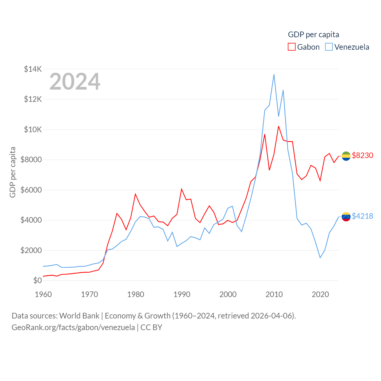 By GDP, Gabon ranks 127/197 ($20.9B) and Venezuela ranks 65/197 ($120B). By GDP per capita, Gabon ranks 93/197 ($8,230), while Venezuela ranks 128/197 ($4,218).