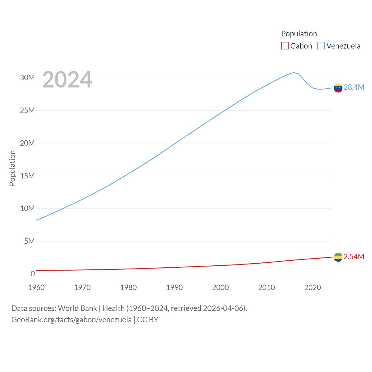 Gabon has a population of 2.54M (ranked 141/197), compared with 28.4M in Venezuela (ranked 53/197). Gabon's land area is 99,487 sq mi versus 340,561 sq mi for Venezuela (ranked 75th vs. 32nd).