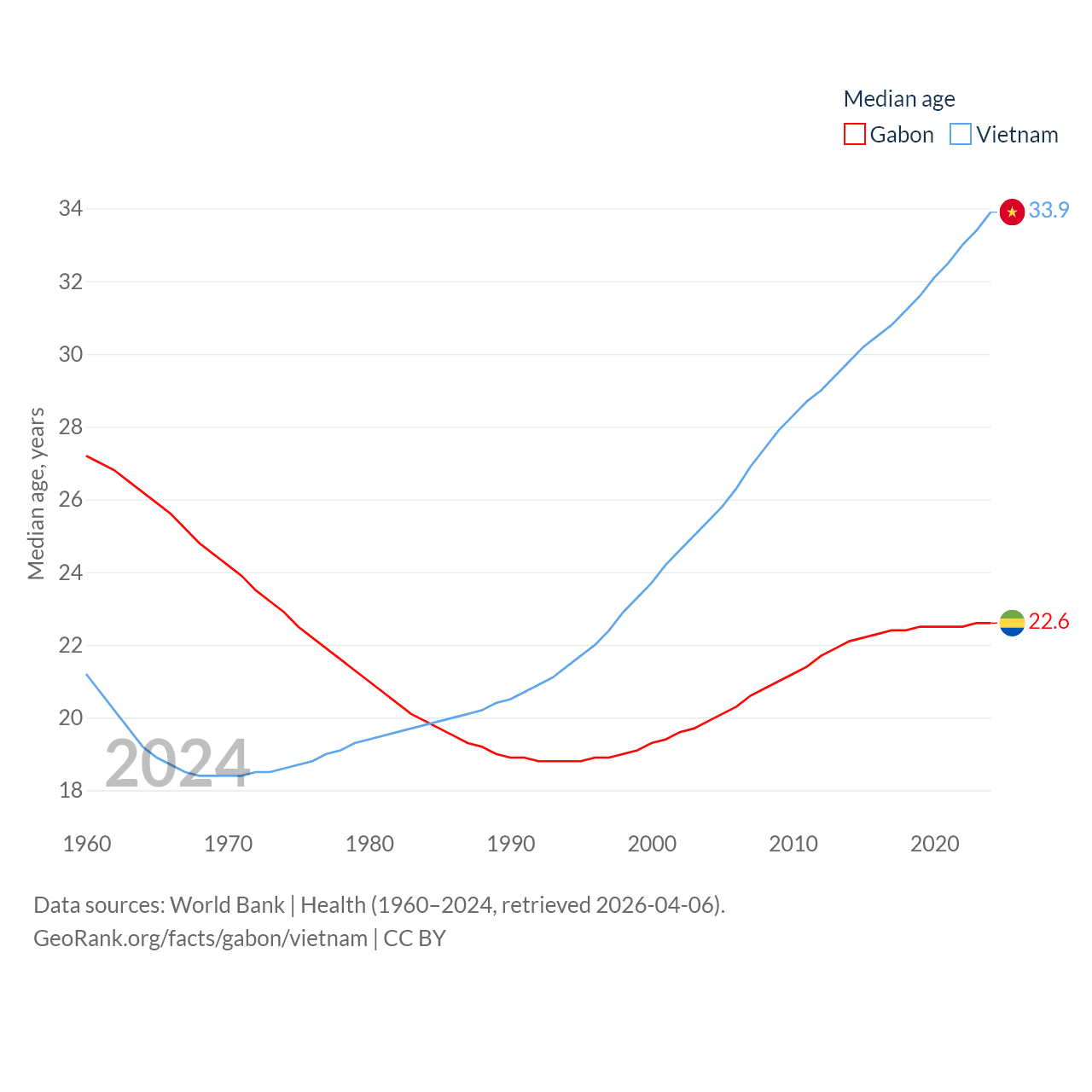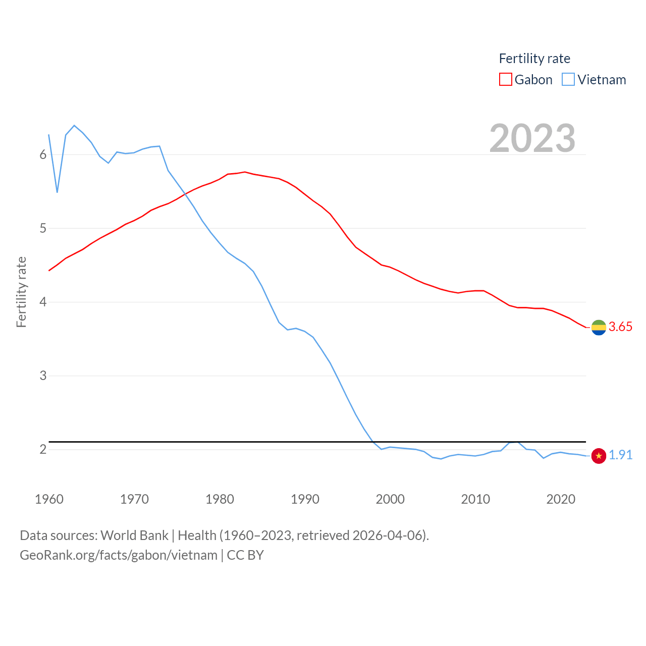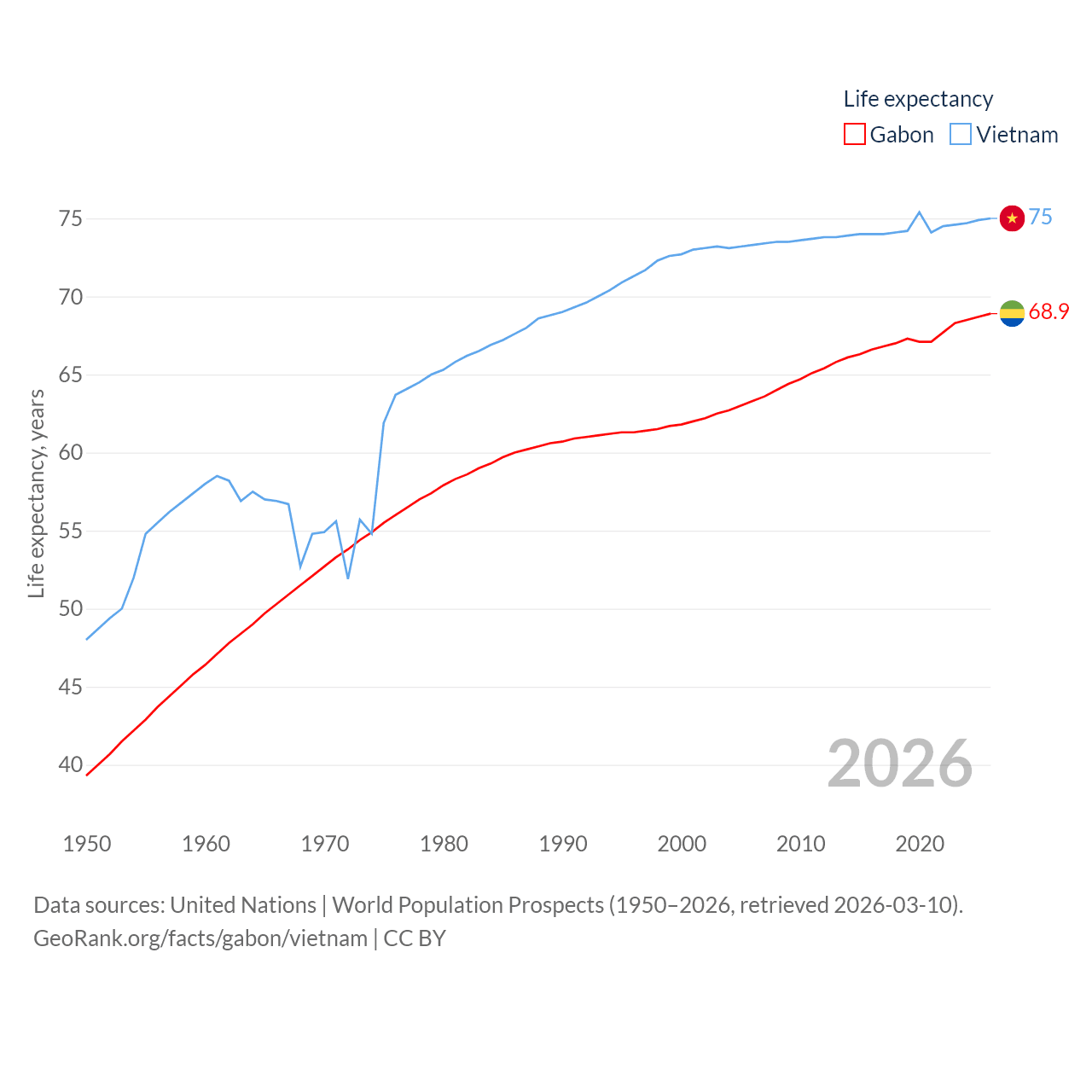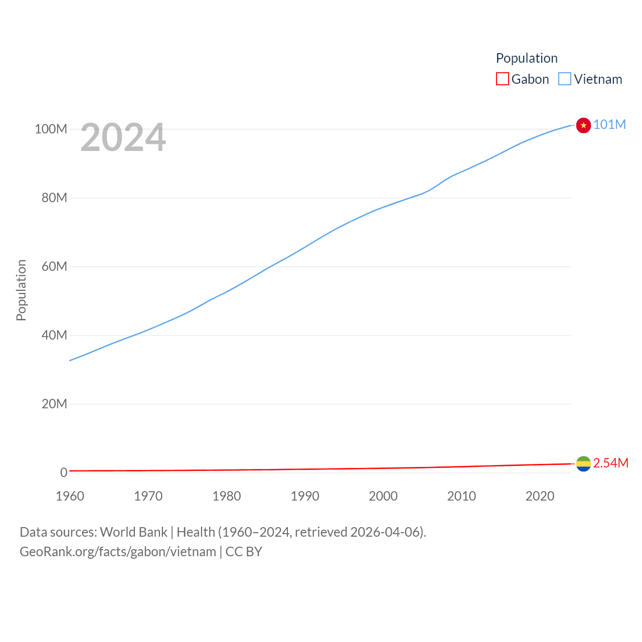 Gabon has a population of 2.54M (ranked 141/197), compared with 101M in Vietnam (ranked 16/197). Gabon's land area is 99,487 sq mi versus 121,016 sq mi for Vietnam (ranked 75th vs. 67th).