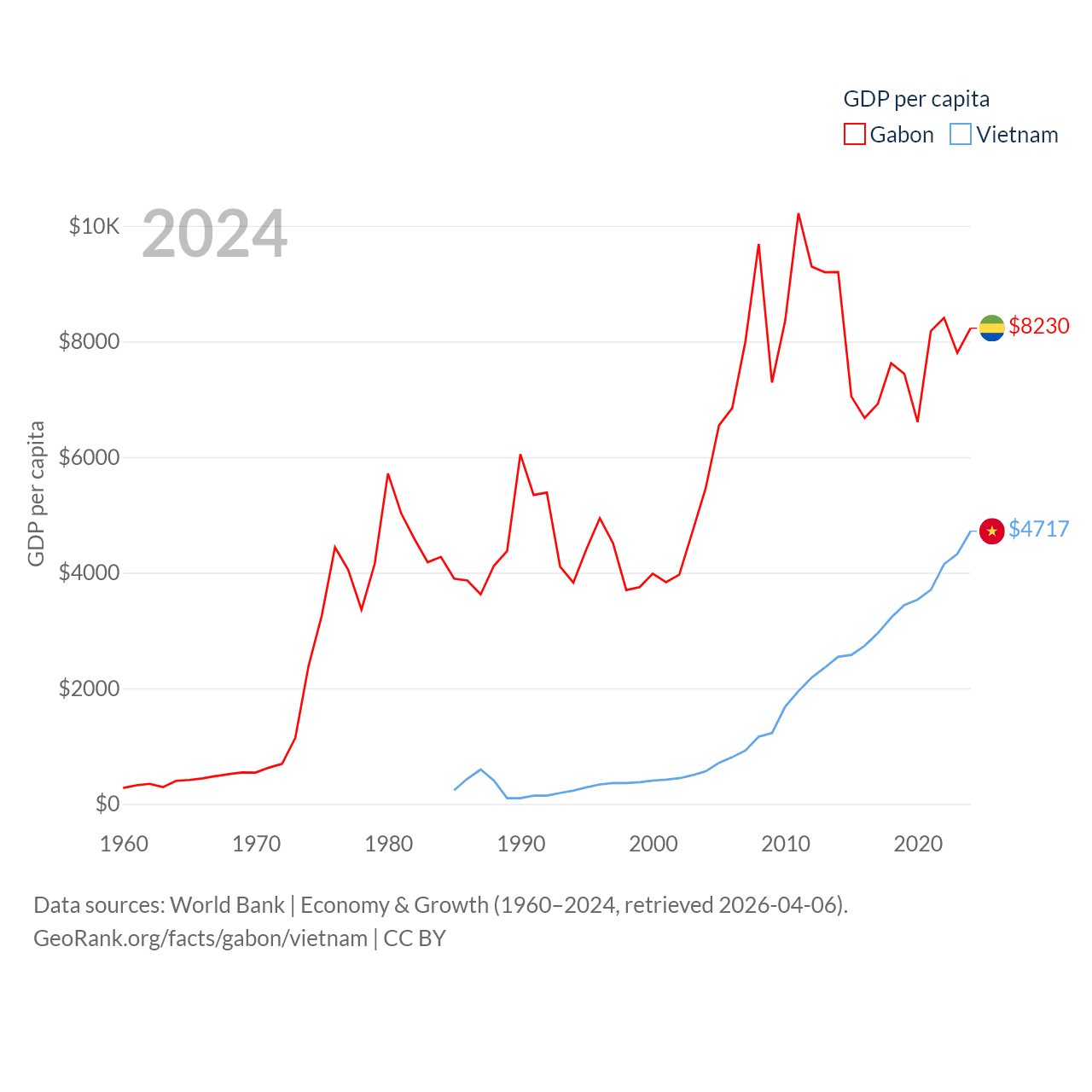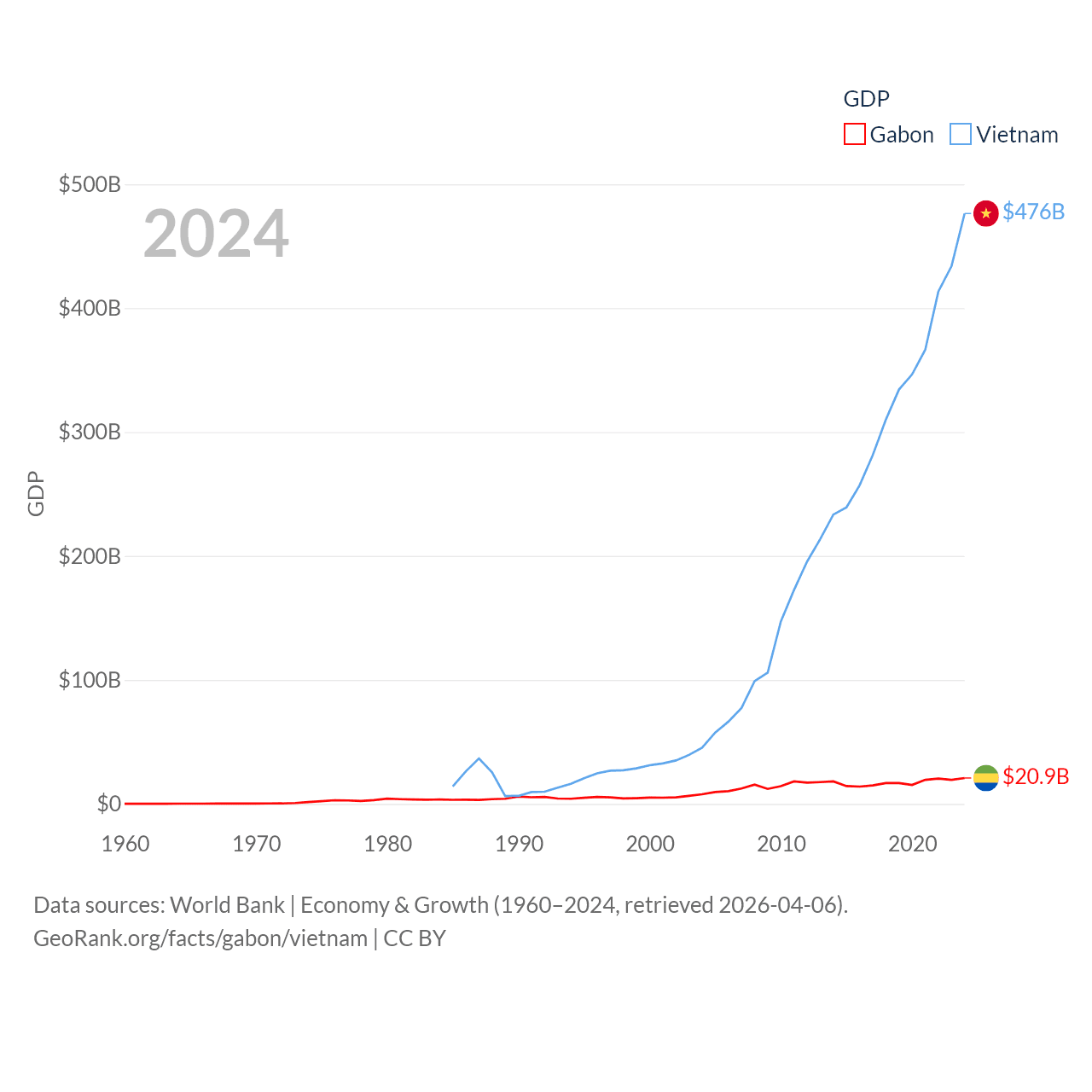 By GDP, Gabon ranks 127/197 ($20.9B) and Vietnam ranks 33/197 ($476B). By GDP per capita, Gabon ranks 93/197 ($8,230), while Vietnam ranks 122/197 ($4,717).