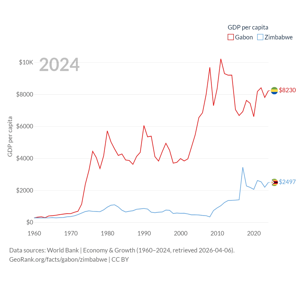 By GDP, Gabon ranks 127/197 ($20.9B) and Zimbabwe ranks 102/197 ($41.5B). By GDP per capita, Gabon ranks 93/197 ($8,230), while Zimbabwe ranks 148/197 ($2,497).