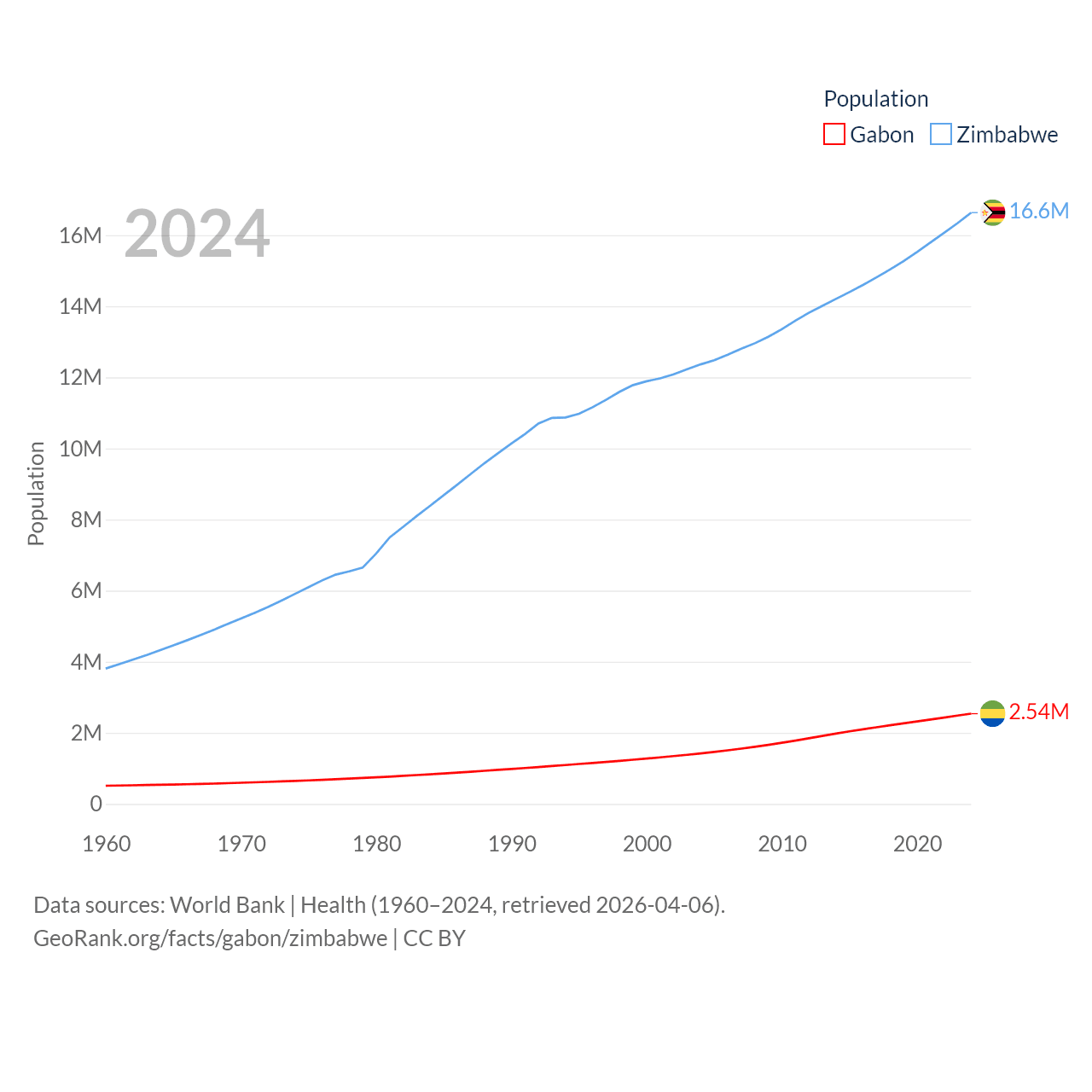 Gabon has a population of 2.54M (ranked 141/197), compared with 16.6M in Zimbabwe (ranked 74/197). Gabon's land area is 99,487 sq mi versus 149,364 sq mi for Zimbabwe (ranked 75th vs. 60th).