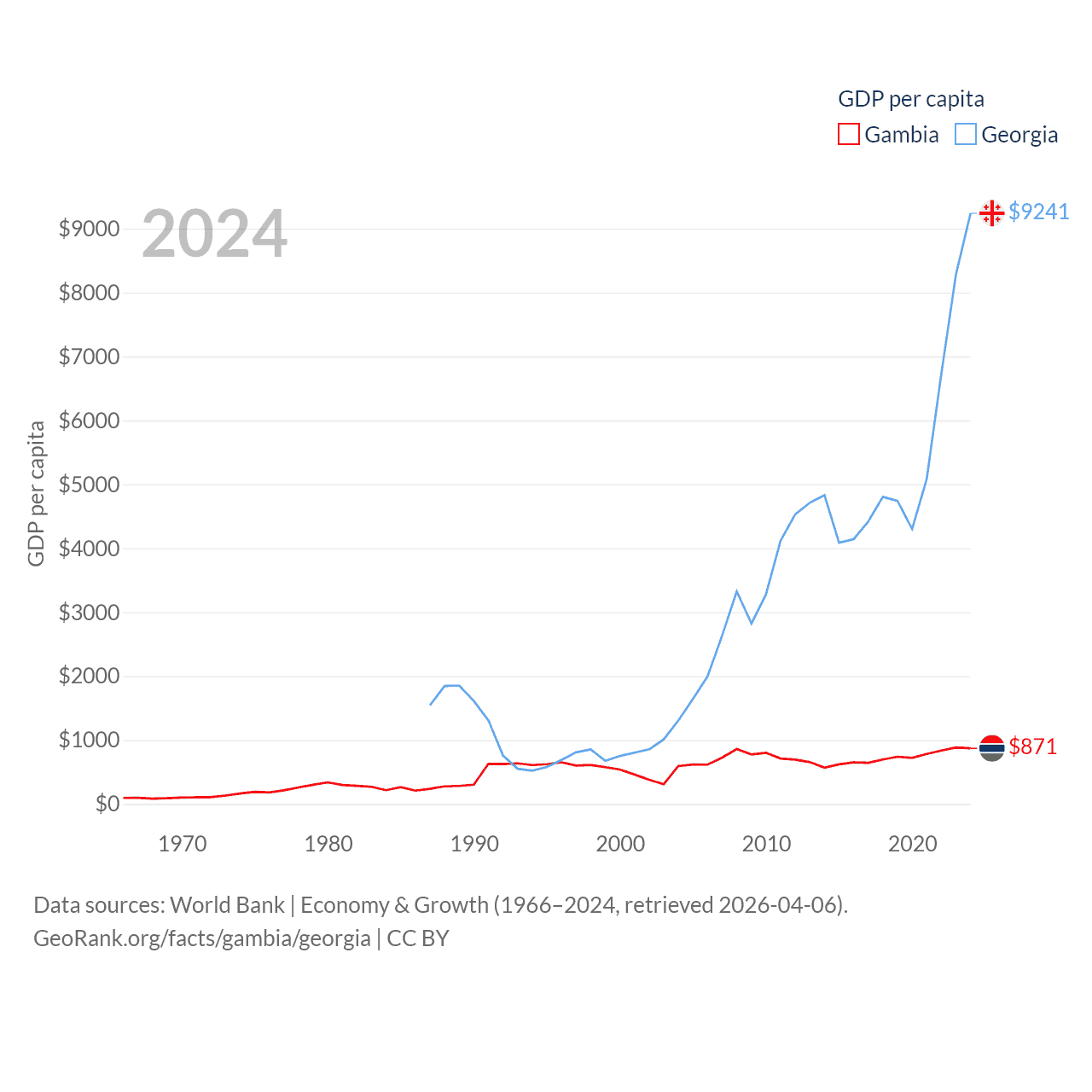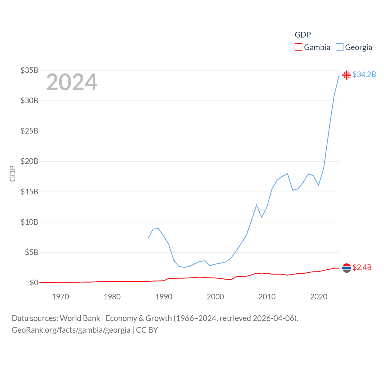 By GDP, The Gambia ranks 174/197 ($2.4B) and Georgia ranks 107/197 ($34.2B). By GDP per capita, The Gambia ranks 183/197 ($871), while Georgia ranks 89/197 ($9,241).