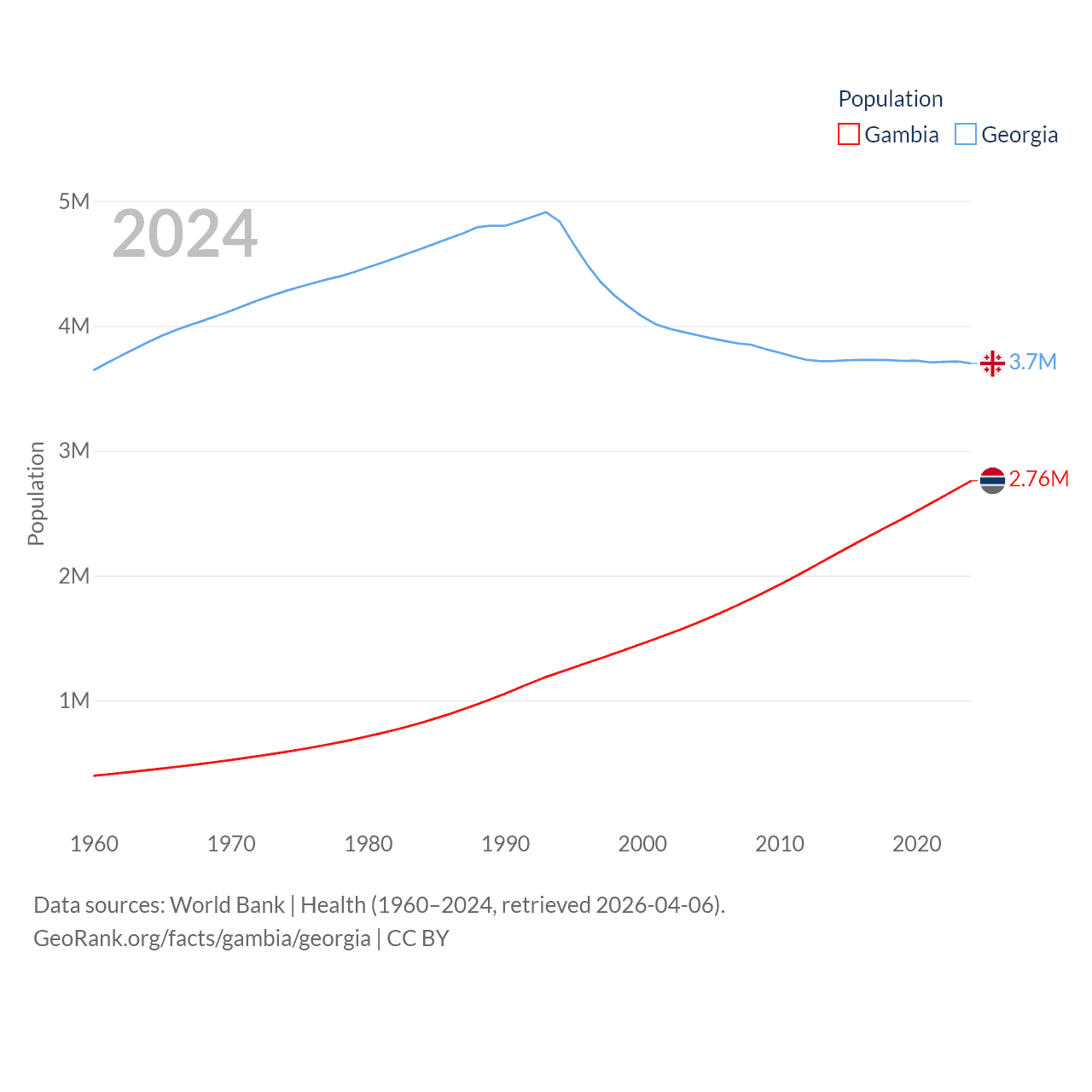 The Gambia has a population of 2.76M (ranked 140/197), compared with 3.7M in Georgia (ranked 130/197). The Gambia's land area is 3,907 sq mi versus 26,830 sq mi for Georgia (ranked 161st vs. 118th).