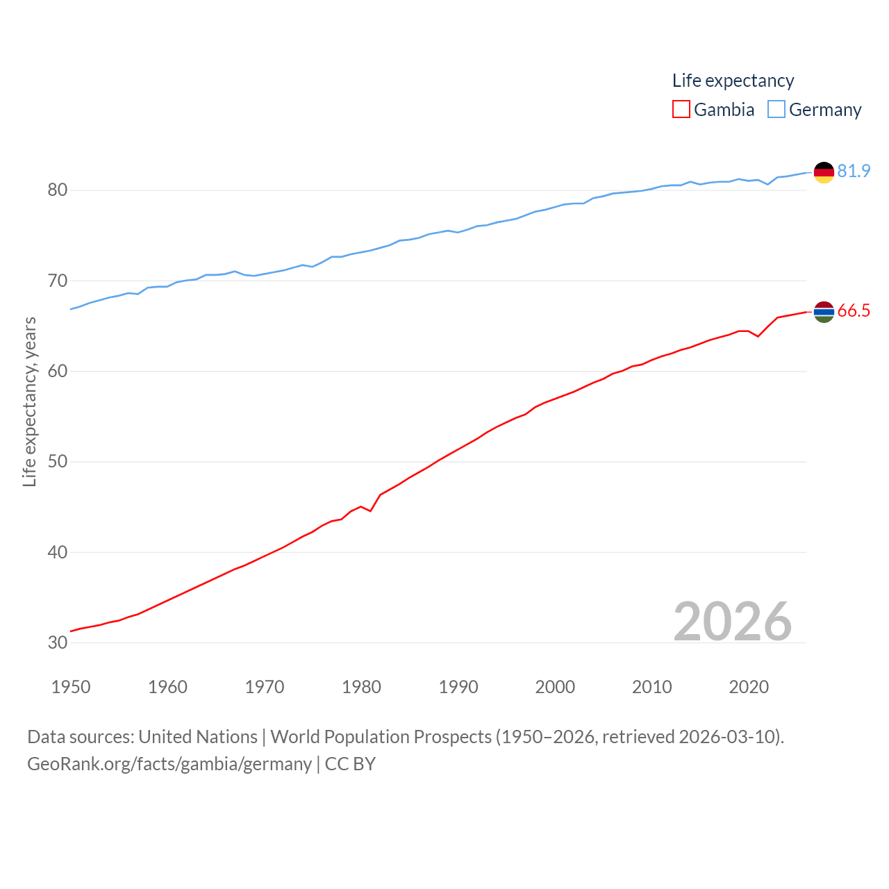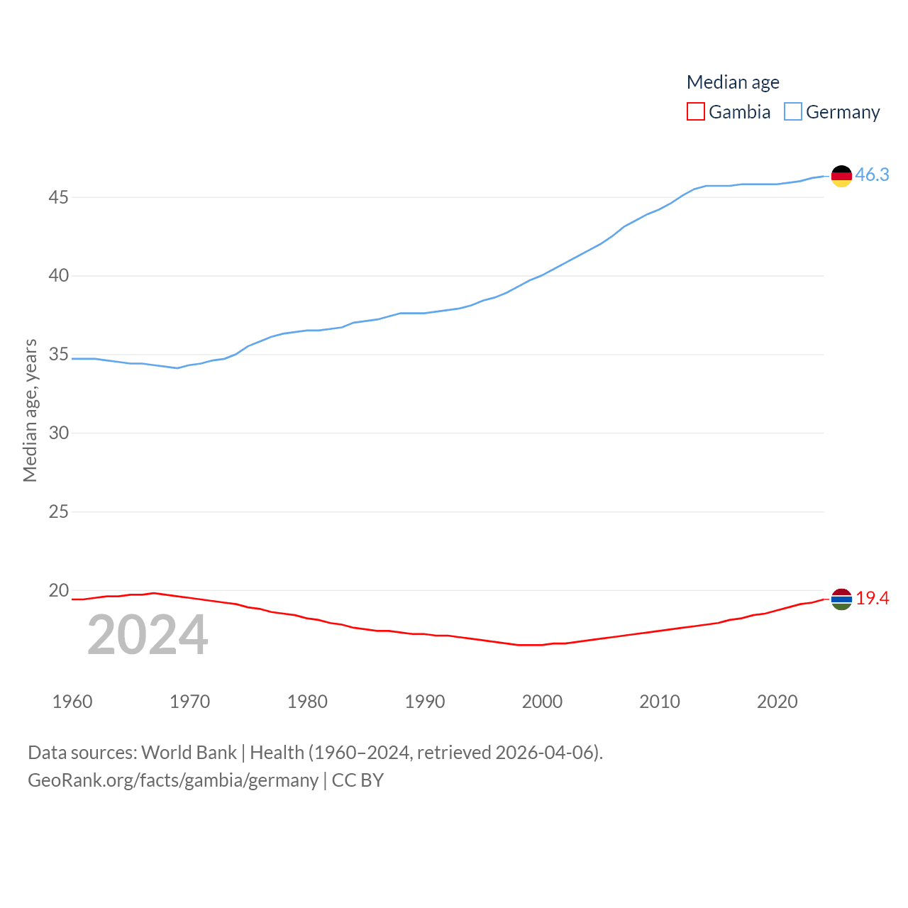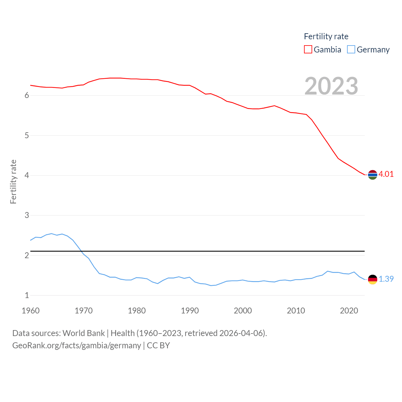 The Gambia has a population of 2.76M (ranked 140/197), compared with 83.5M in Germany (ranked 19/197). The Gambia's land area is 3,907 sq mi versus 134,916 sq mi for Germany (ranked 161st vs. 63rd).