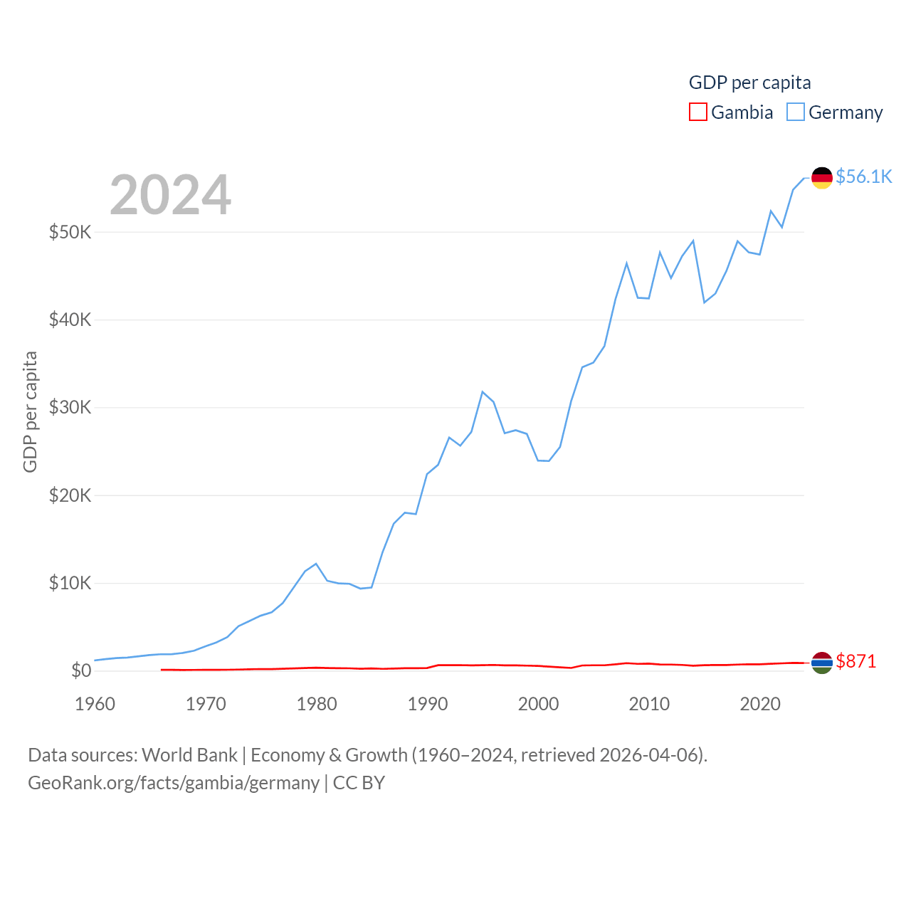 By GDP, The Gambia ranks 174/197 ($2.4B) and Germany ranks 3/197 ($4.69T). By GDP per capita, The Gambia ranks 183/197 ($871), while Germany ranks 19/197 ($56,104).