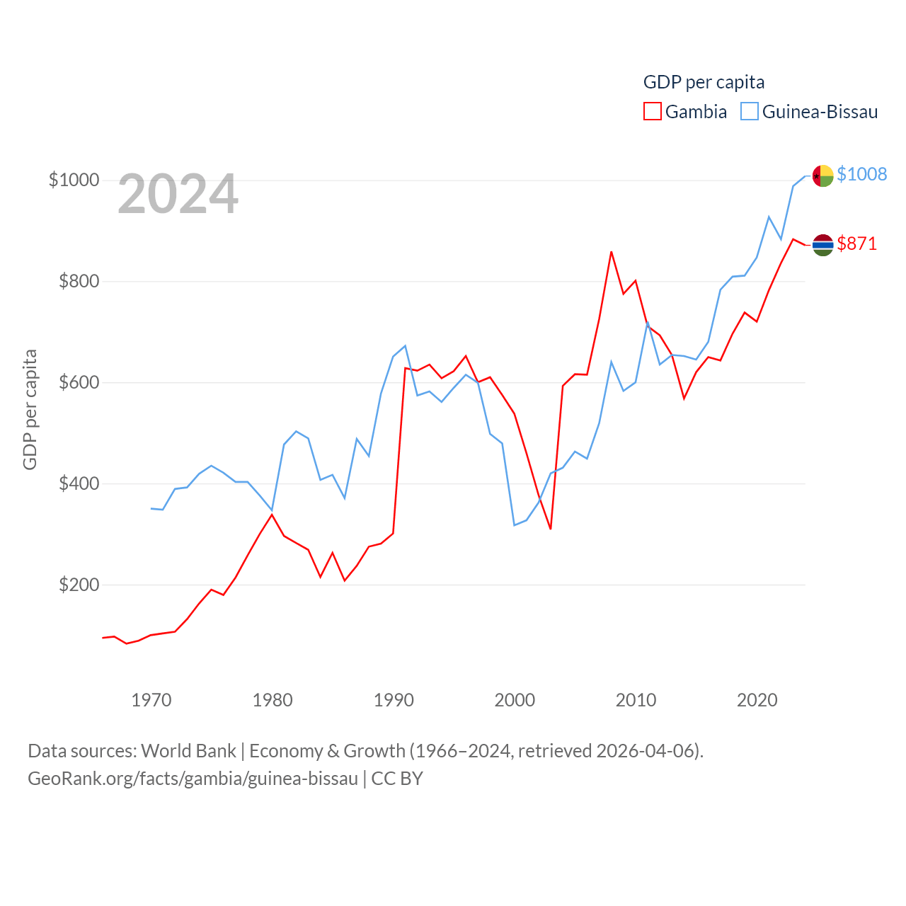 By GDP, The Gambia ranks 174/197 ($2.4B) and Guinea-Bissau ranks 176/197 ($2.22B). By GDP per capita, The Gambia ranks 183/197 ($871), while Guinea-Bissau ranks 177/197 ($1,008).