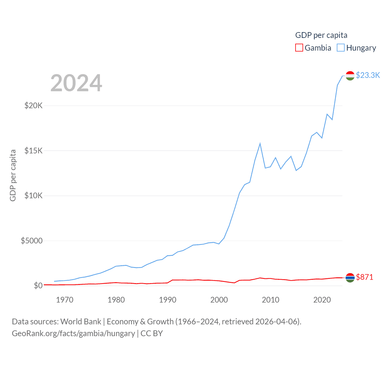 By GDP, The Gambia ranks 174/197 ($2.4B) and Hungary ranks 55/197 ($223B). By GDP per capita, The Gambia ranks 183/197 ($871), while Hungary ranks 55/197 ($23,292).