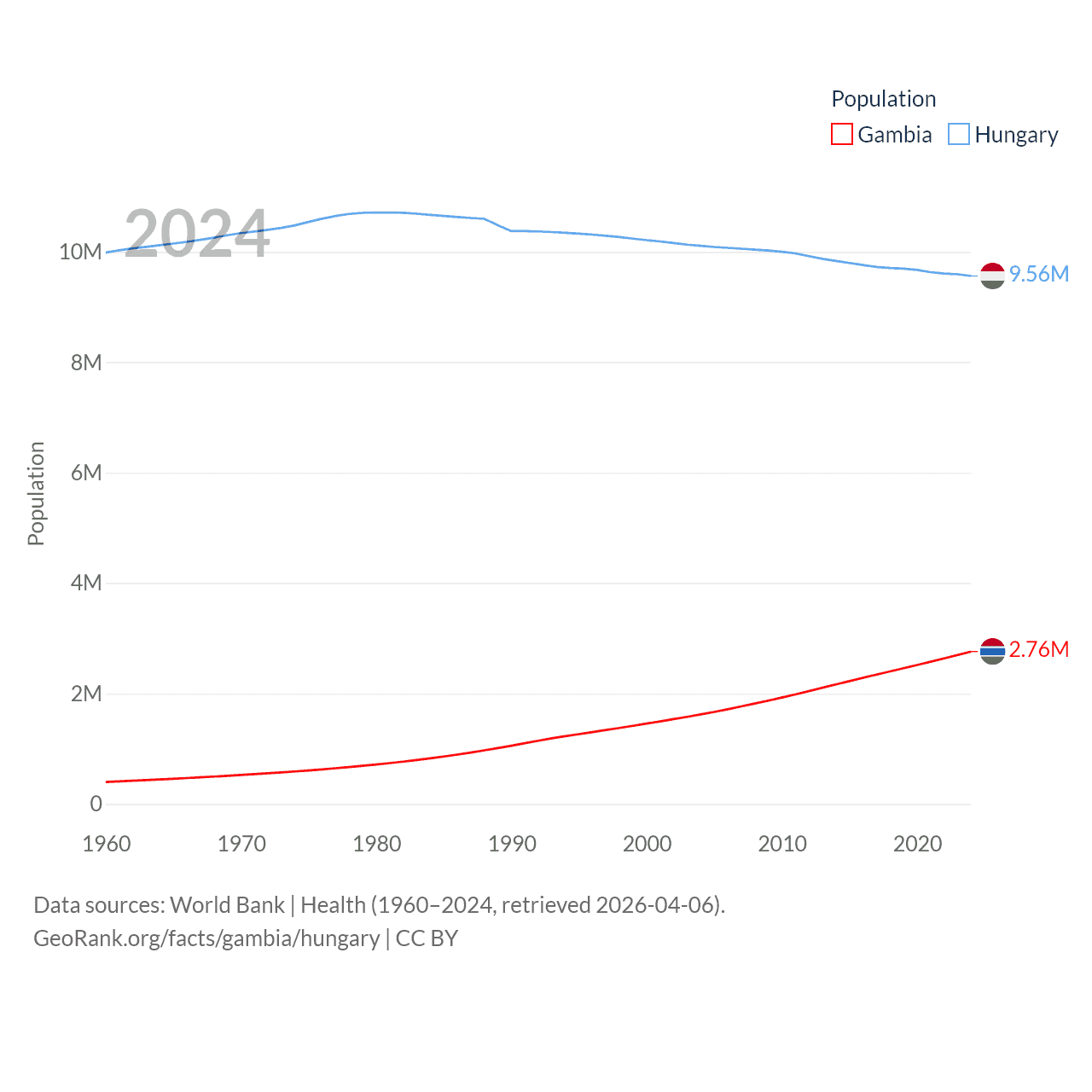 The Gambia has a population of 2.76M (ranked 140/197), compared with 9.56M in Hungary (ranked 97/197). The Gambia's land area is 3,907 sq mi versus 35,236 sq mi for Hungary (ranked 161st vs. 109th).
