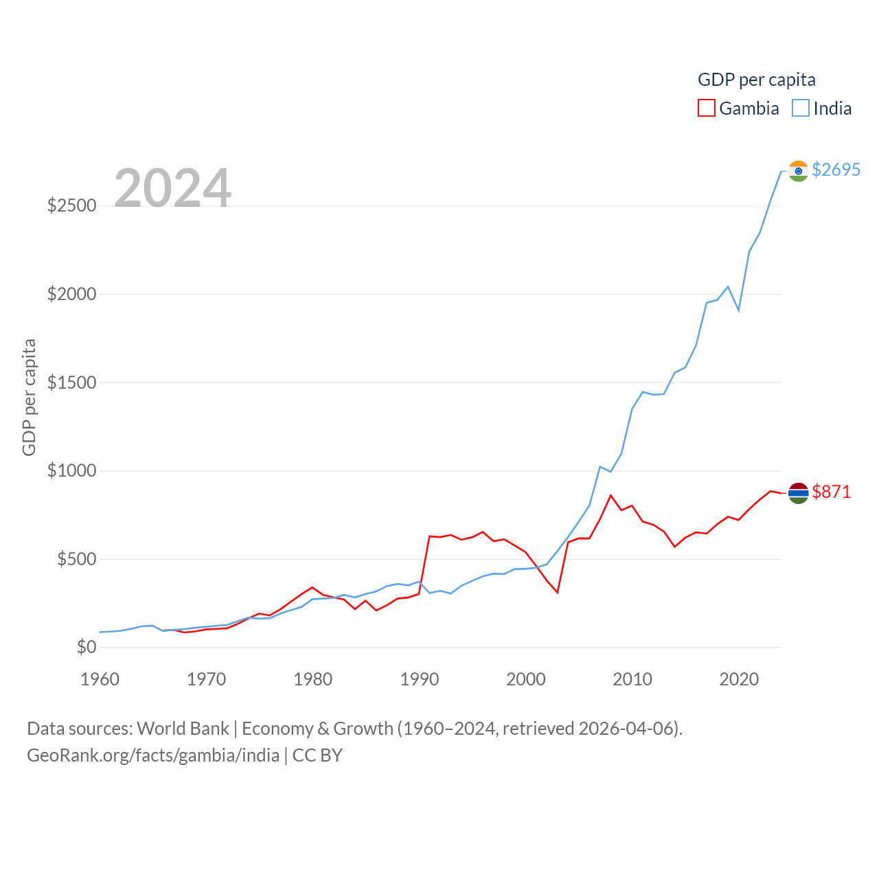 By GDP, The Gambia ranks 174/197 ($2.4B) and India ranks 5/197 ($3.91T). By GDP per capita, The Gambia ranks 183/197 ($871), while India ranks 143/197 ($2,695).