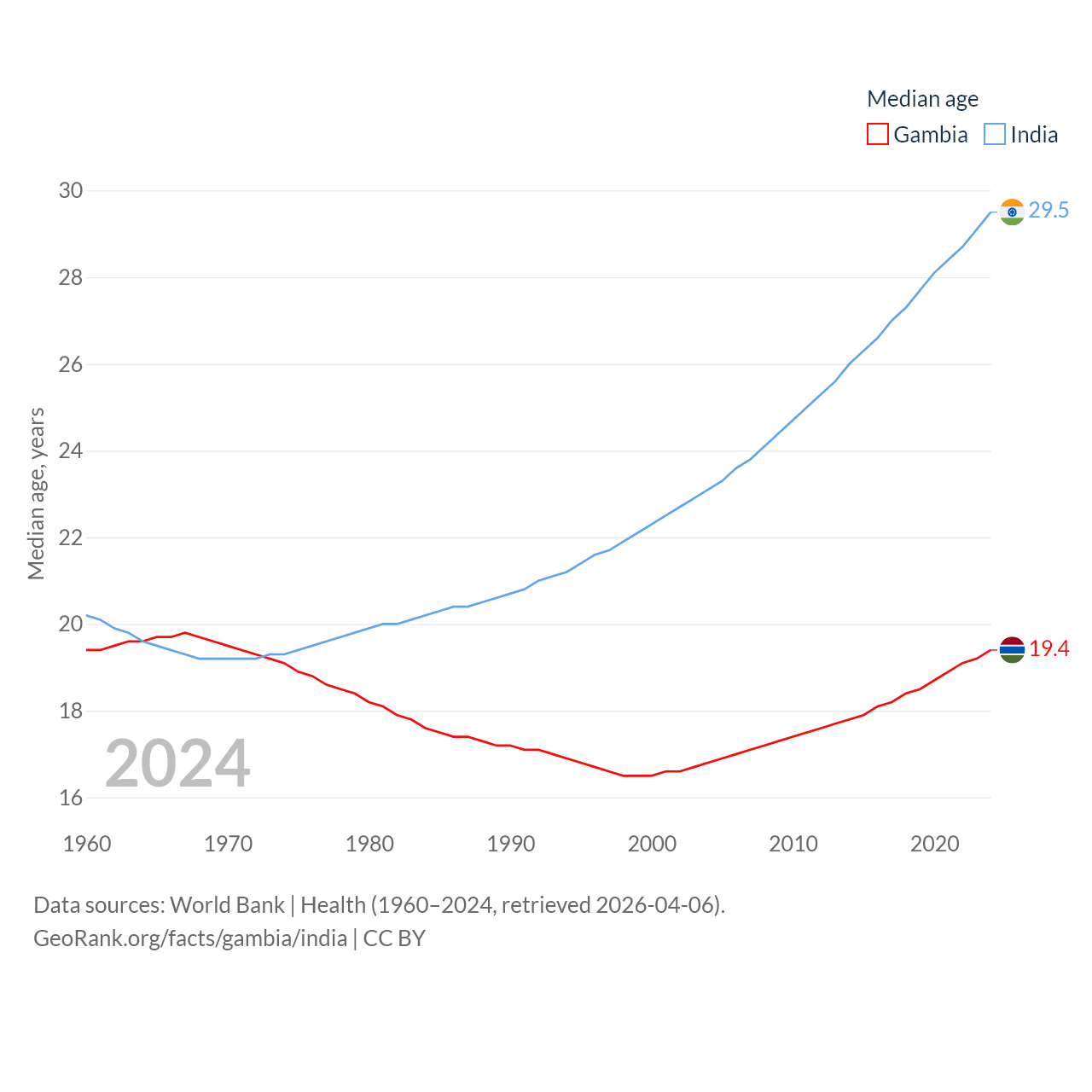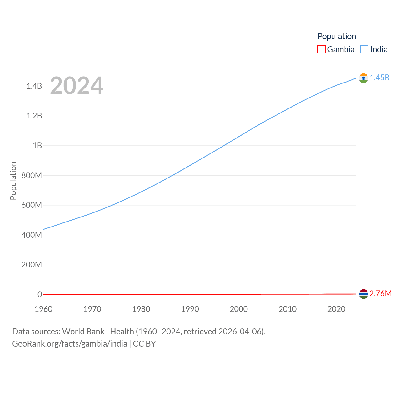 The Gambia has a population of 2.76M (ranked 140/197), compared with 1.45B in India (ranked 1/197). The Gambia's land area is 3,907 sq mi versus 1,147,955 sq mi for India (ranked 161st vs. 7th).