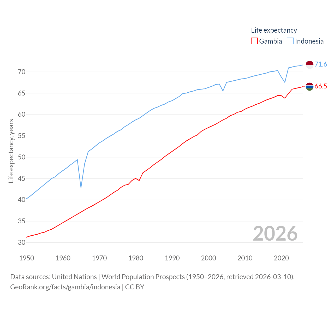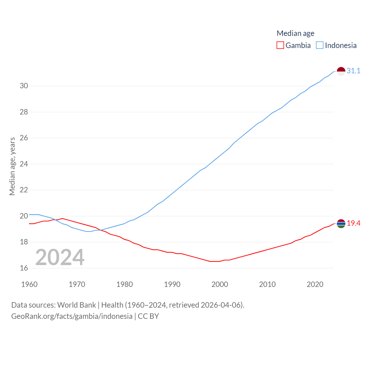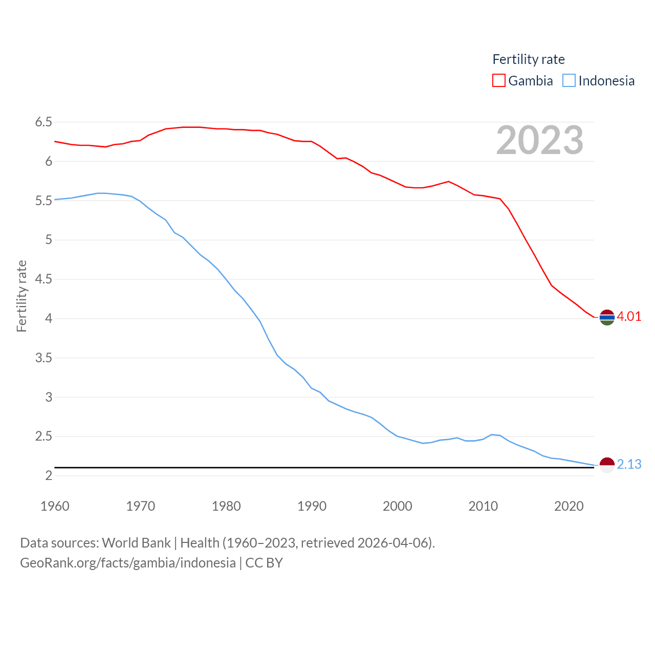 The Gambia has a population of 2.76M (ranked 140/197), compared with 283M in Indonesia (ranked 4/197). The Gambia's land area is 3,907 sq mi versus 730,720 sq mi for Indonesia (ranked 161st vs. 14th).