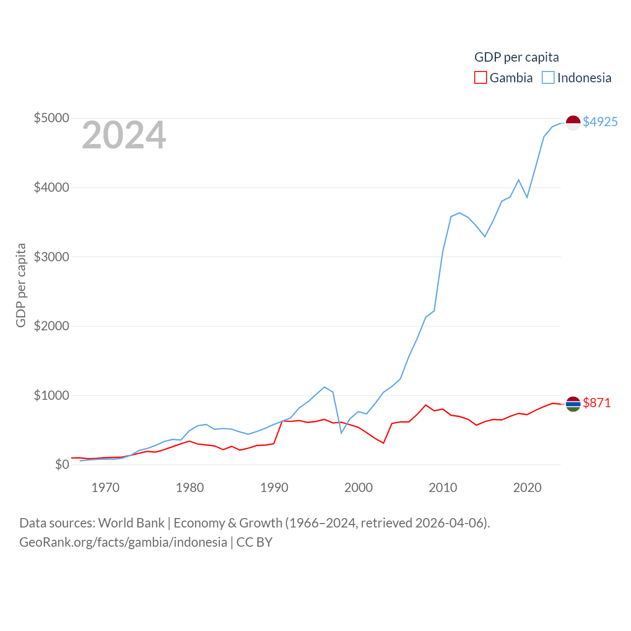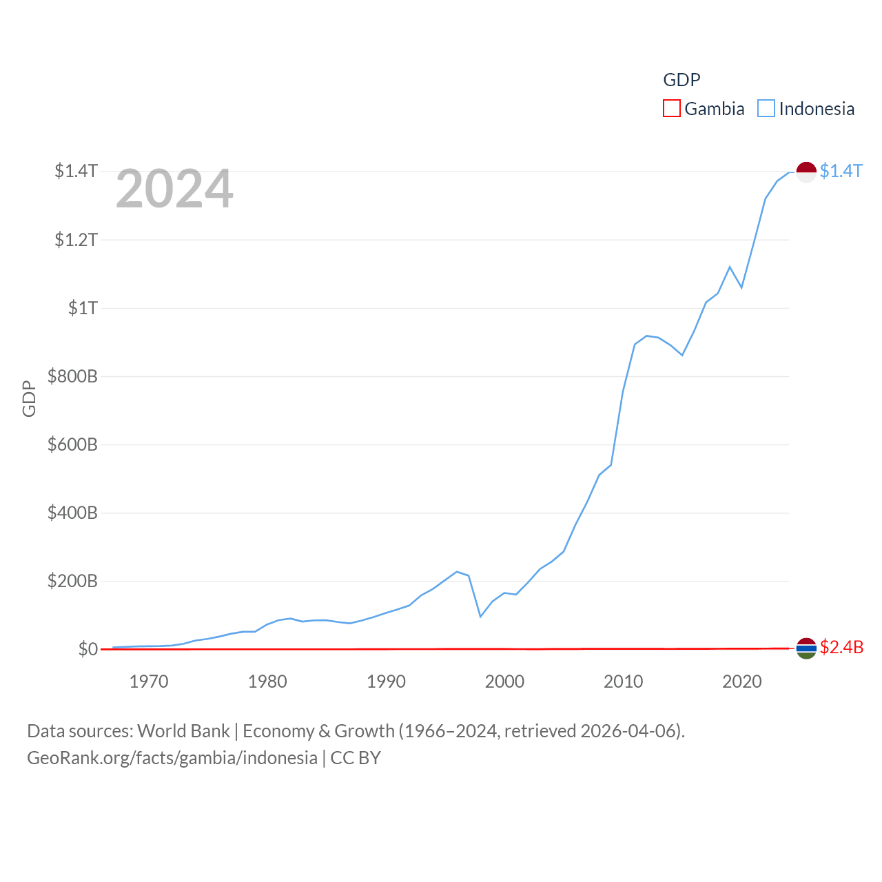 By GDP, The Gambia ranks 174/197 ($2.4B) and Indonesia ranks 16/197 ($1.4T). By GDP per capita, The Gambia ranks 183/197 ($871), while Indonesia ranks 121/197 ($4,925).