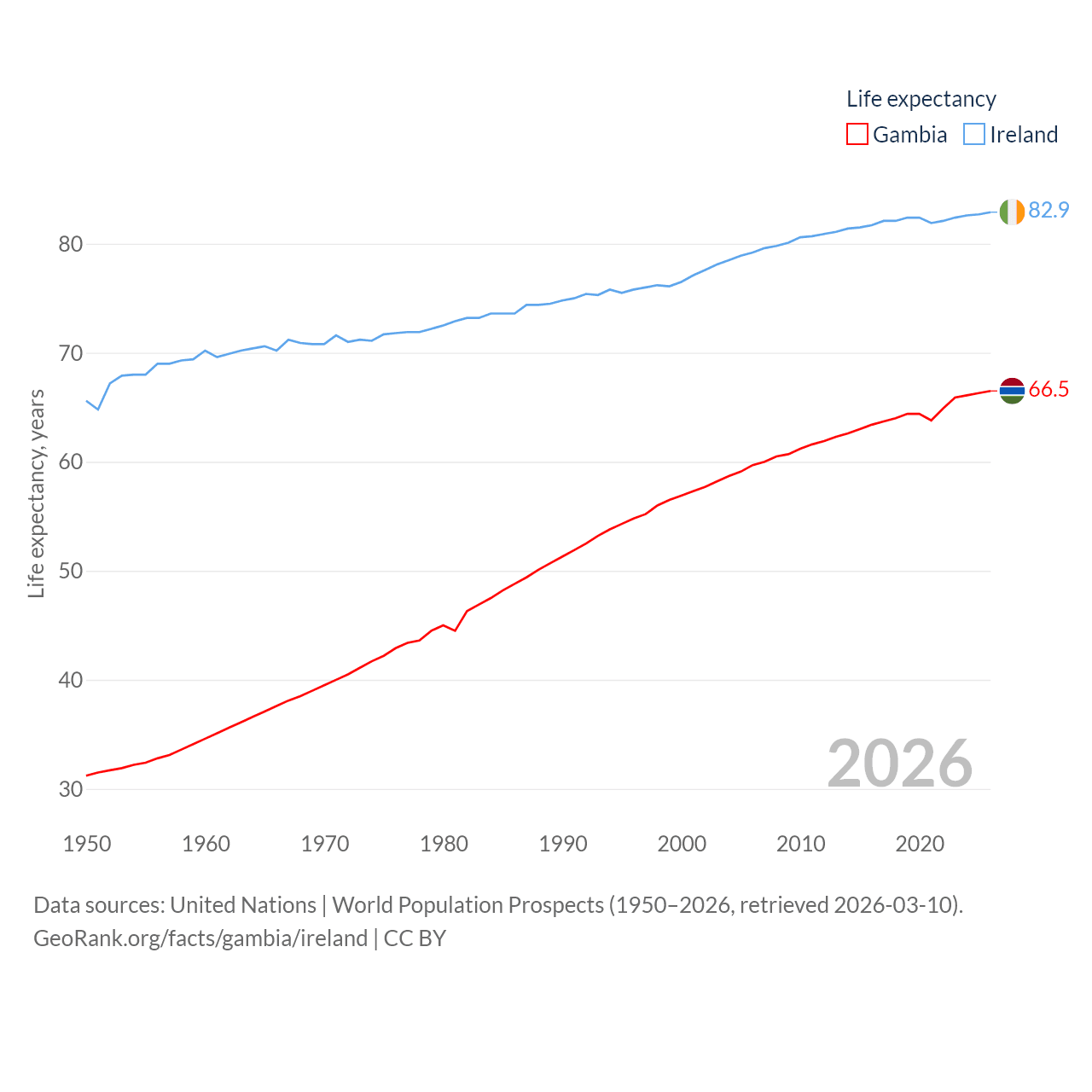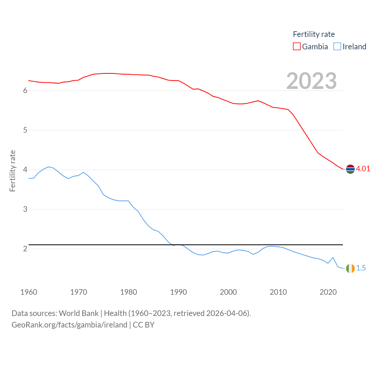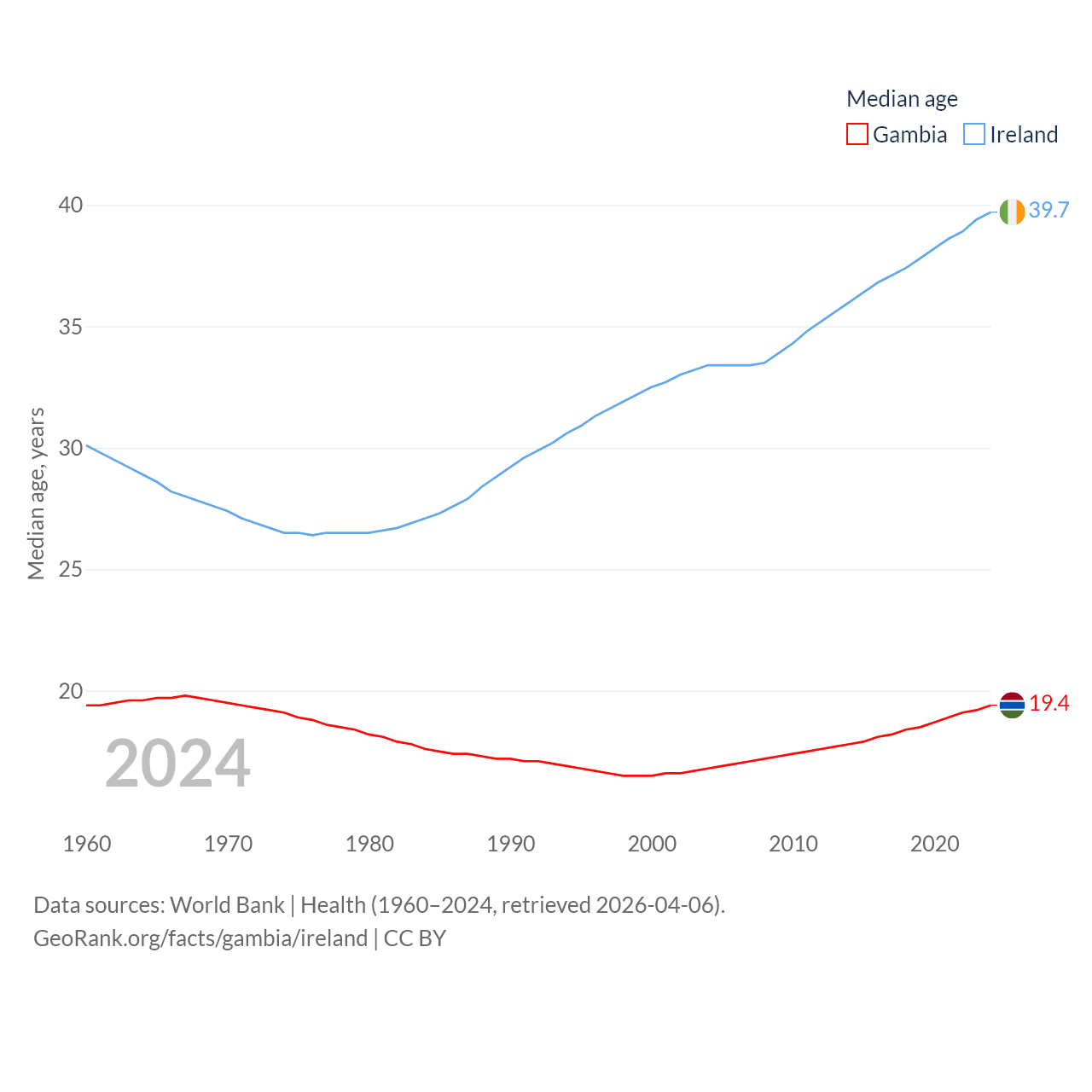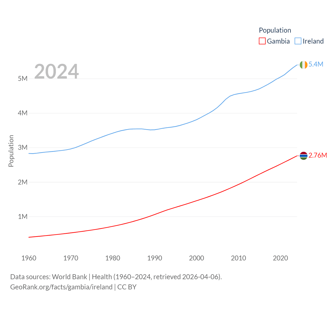 The Gambia has a population of 2.76M (ranked 140/197), compared with 5.4M in Ireland (ranked 120/197). The Gambia's land area is 3,907 sq mi versus 26,599 sq mi for Ireland (ranked 161st vs. 119th).