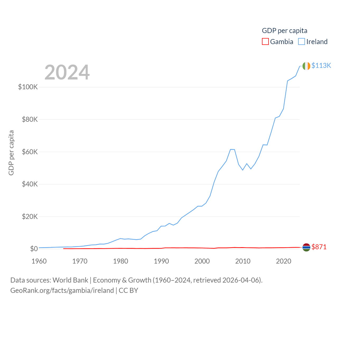 By GDP, The Gambia ranks 174/197 ($2.4B) and Ireland ranks 25/197 ($609B). By GDP per capita, The Gambia ranks 183/197 ($871), while Ireland ranks 4/197 ($112,895).