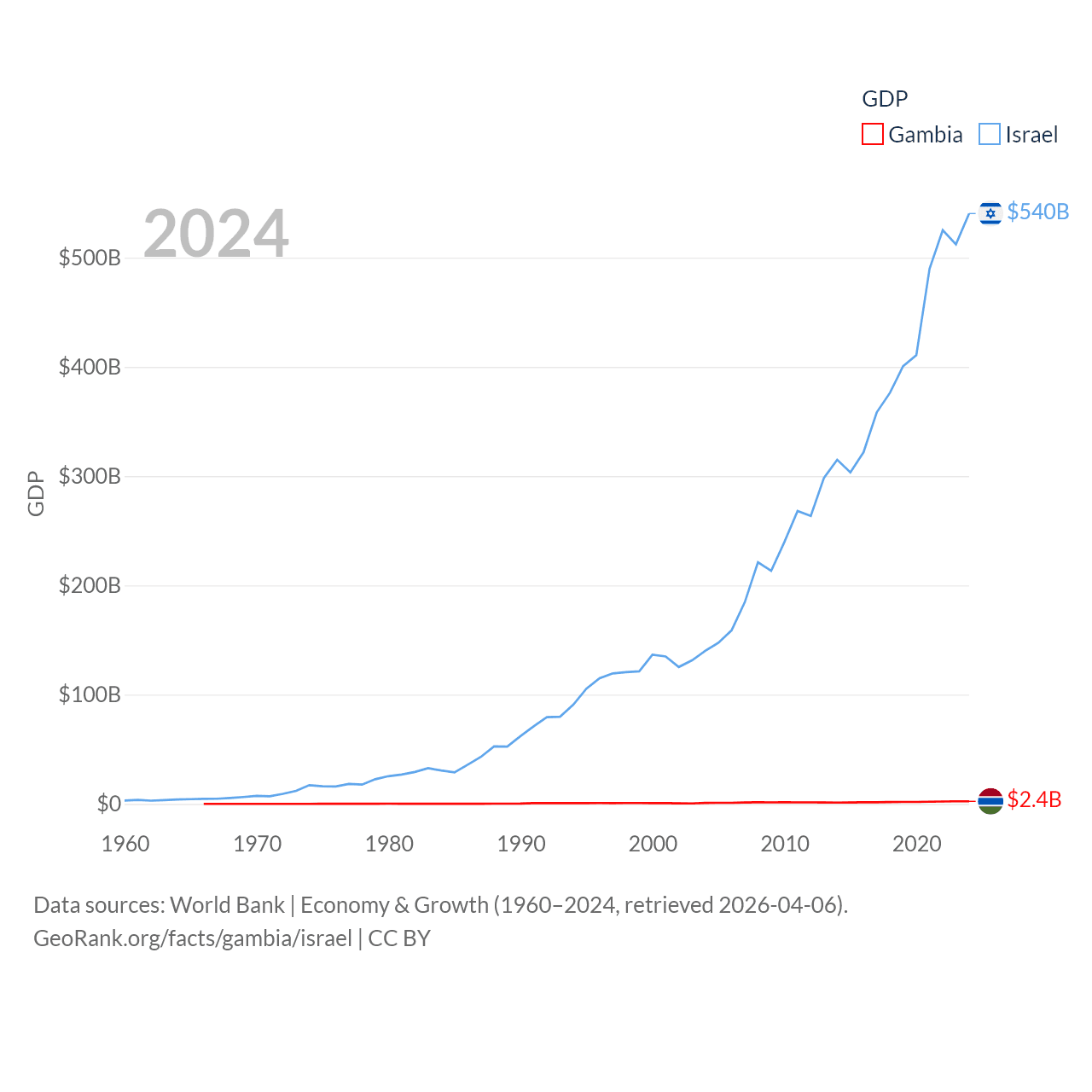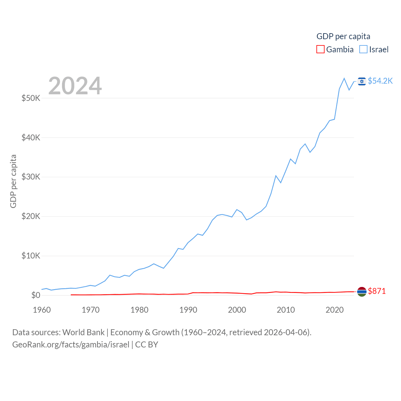 By GDP, The Gambia ranks 174/197 ($2.4B) and Israel ranks 29/197 ($540B). By GDP per capita, The Gambia ranks 183/197 ($871), while Israel ranks 21/197 ($54,177).