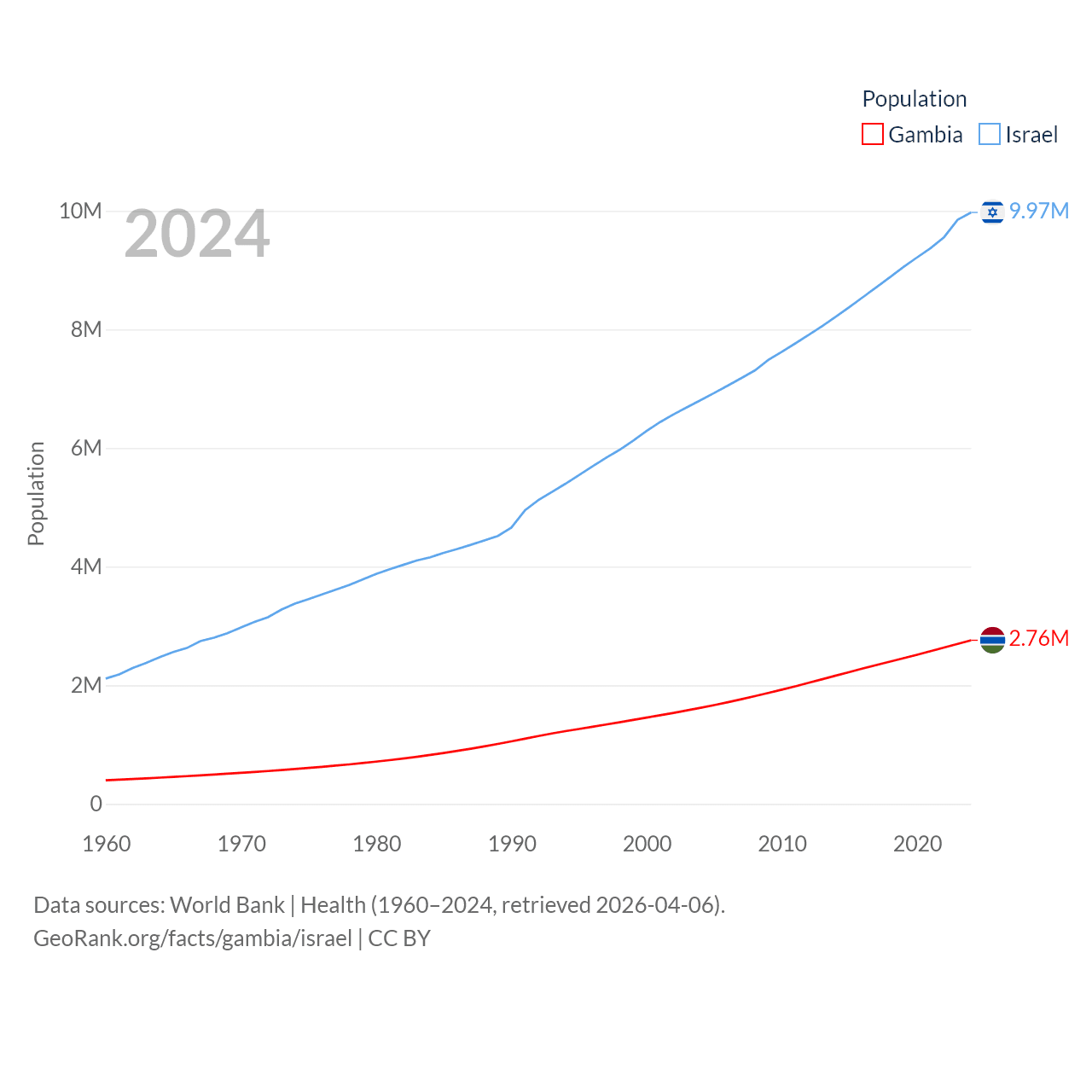 The Gambia has a population of 2.76M (ranked 140/197), compared with 9.97M in Israel (ranked 96/197). The Gambia's land area is 3,907 sq mi versus 8,355 sq mi for Israel (ranked 161st vs. 149th).