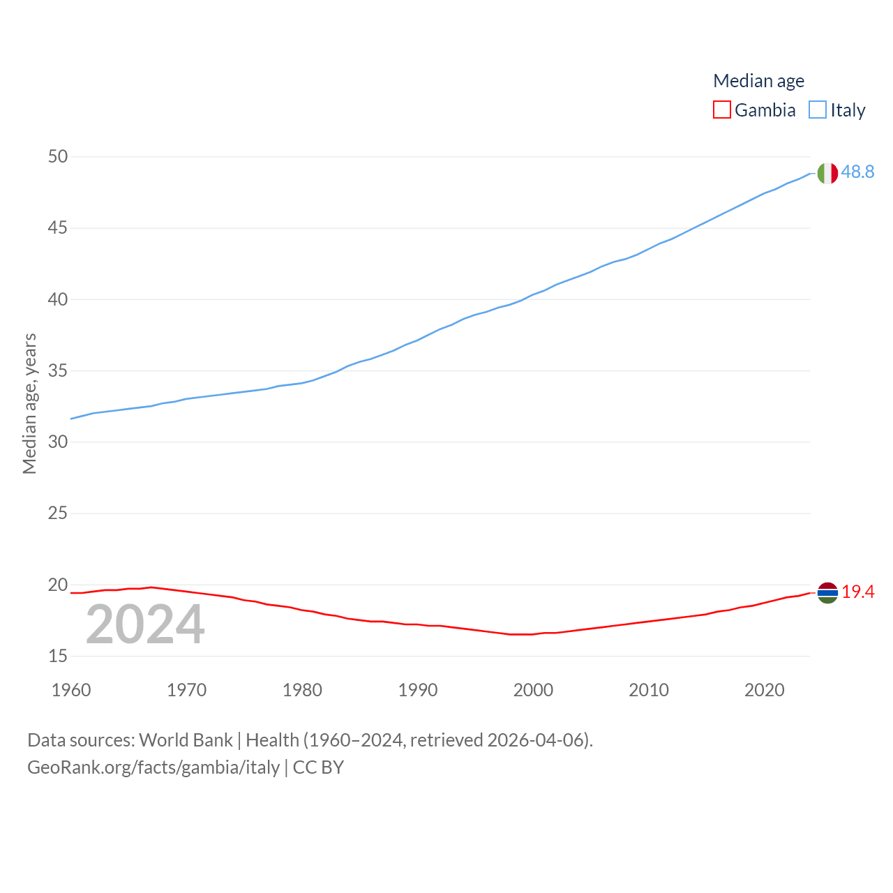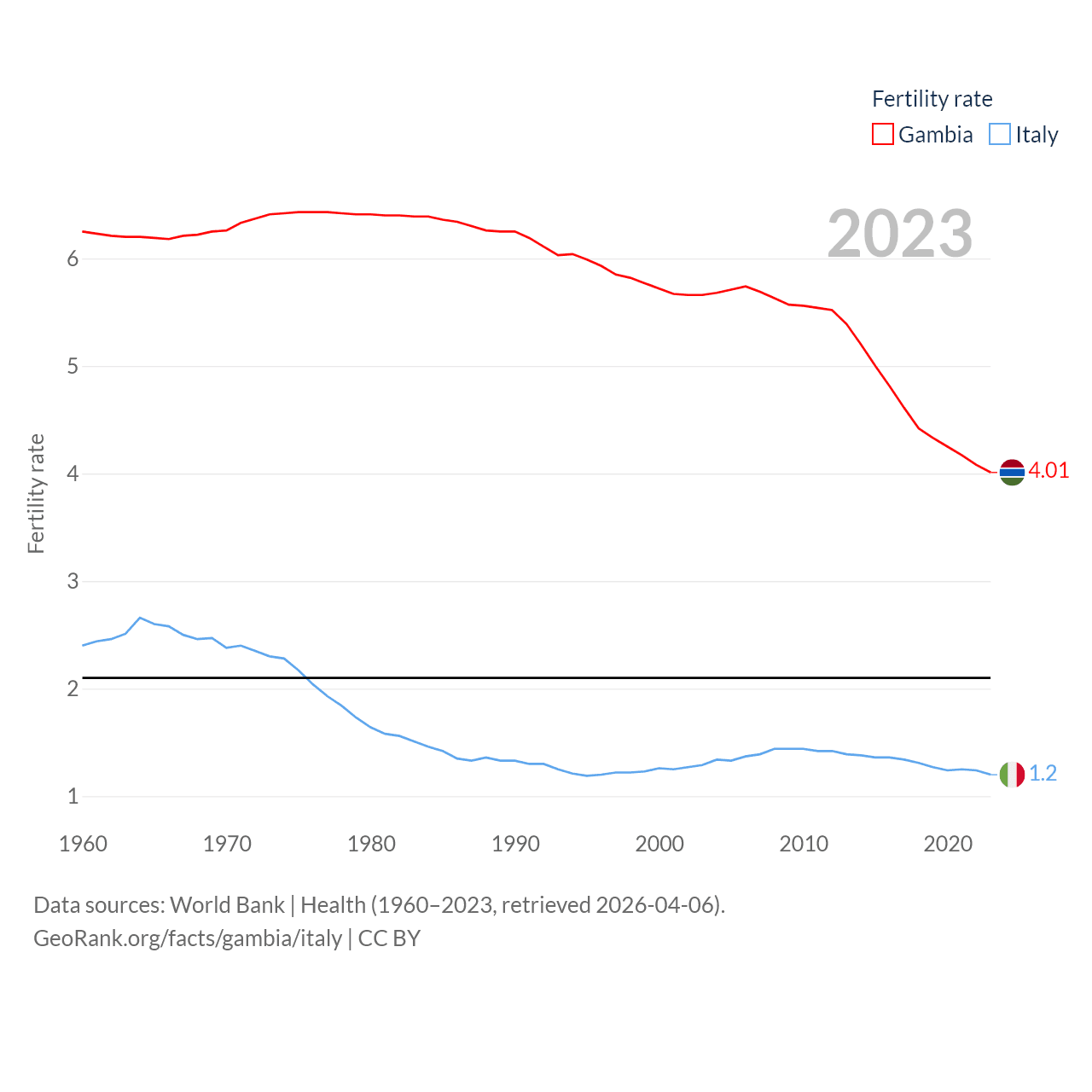 The Gambia has a population of 2.76M (ranked 140/197), compared with 59M in Italy (ranked 25/197). The Gambia's land area is 3,907 sq mi versus 114,178 sq mi for Italy (ranked 161st vs. 72nd).