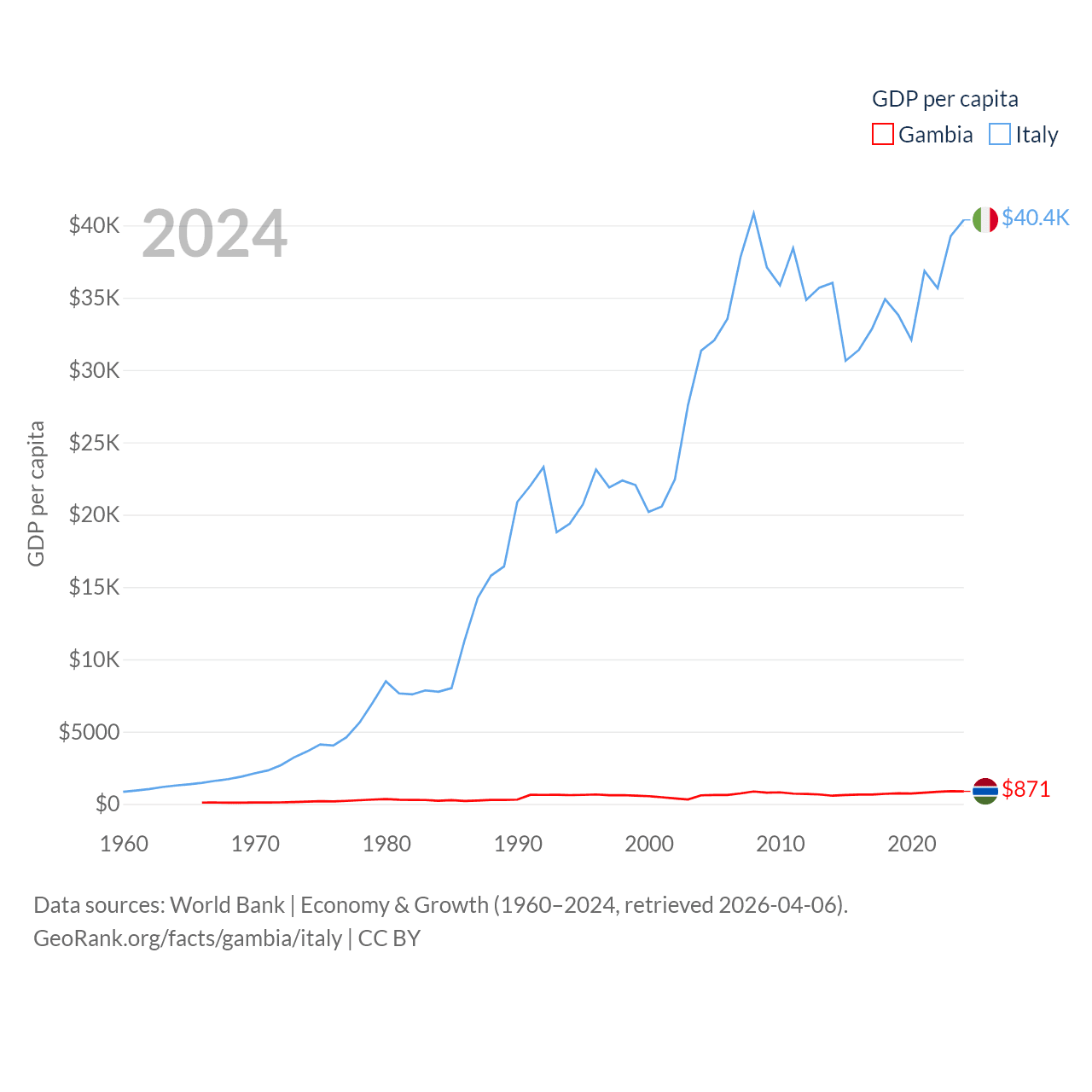 By GDP, The Gambia ranks 174/197 ($2.4B) and Italy ranks 8/197 ($2.38T). By GDP per capita, The Gambia ranks 183/197 ($871), while Italy ranks 29/197 ($40,385).