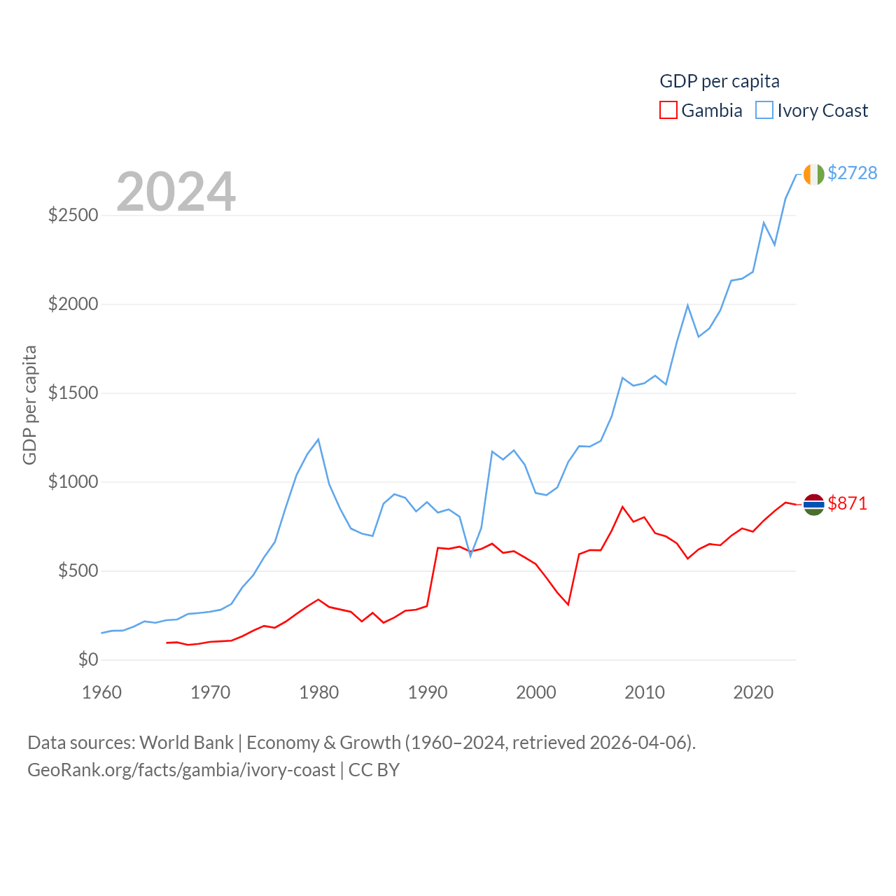 By GDP, The Gambia ranks 174/197 ($2.4B) and Ivory Coast ranks 77/197 ($87.1B). By GDP per capita, The Gambia ranks 183/197 ($871), while Ivory Coast ranks 142/197 ($2,728).