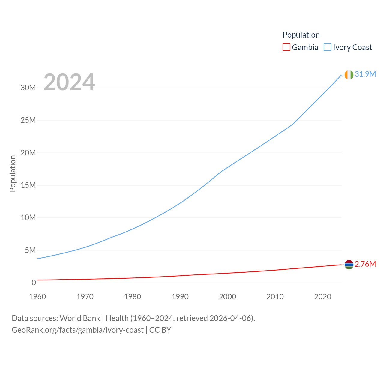 The Gambia has a population of 2.76M (ranked 140/197), compared with 31.9M in Ivory Coast (ranked 50/197). The Gambia's land area is 3,907 sq mi versus 122,780 sq mi for Ivory Coast (ranked 161st vs. 66th).
