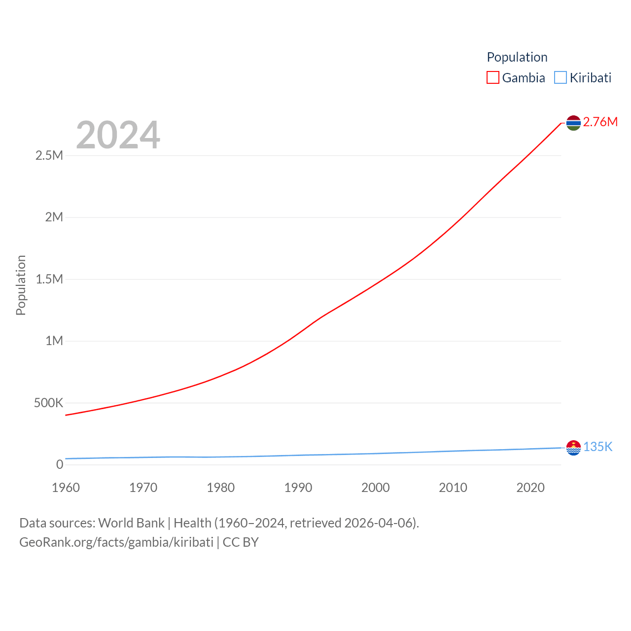 The Gambia has a population of 2.76M (ranked 140/197), compared with 135K in Kiribati (ranked 180/197). The Gambia's land area is 3,907 sq mi versus 313 sq mi for Kiribati (ranked 161st vs. 173rd).