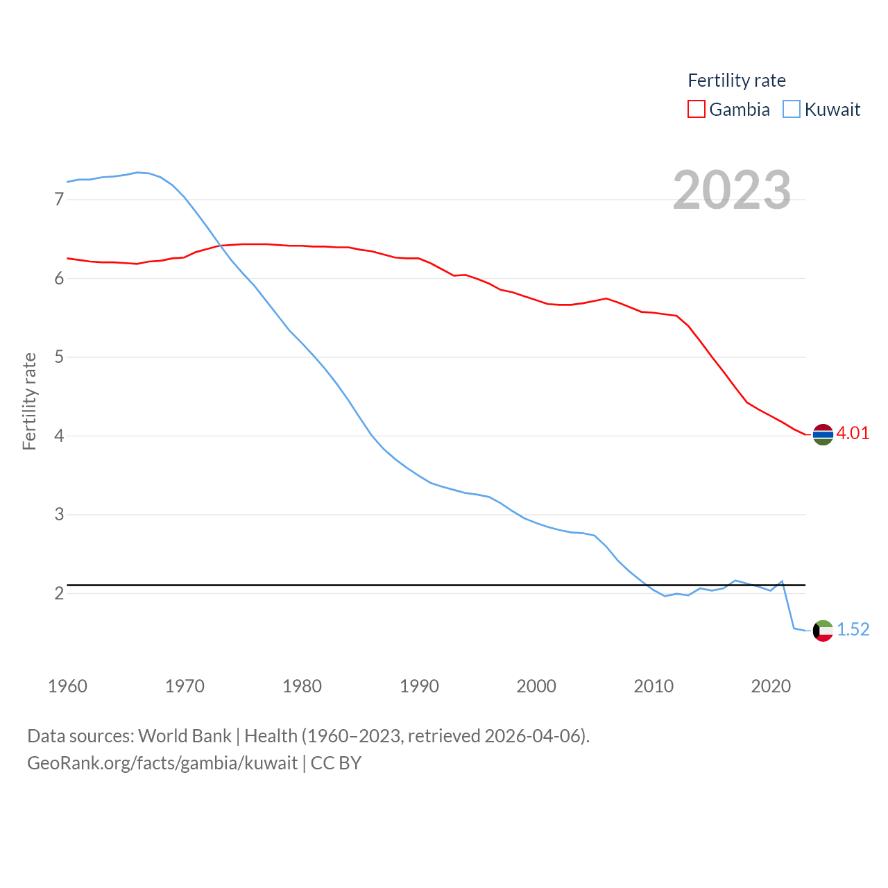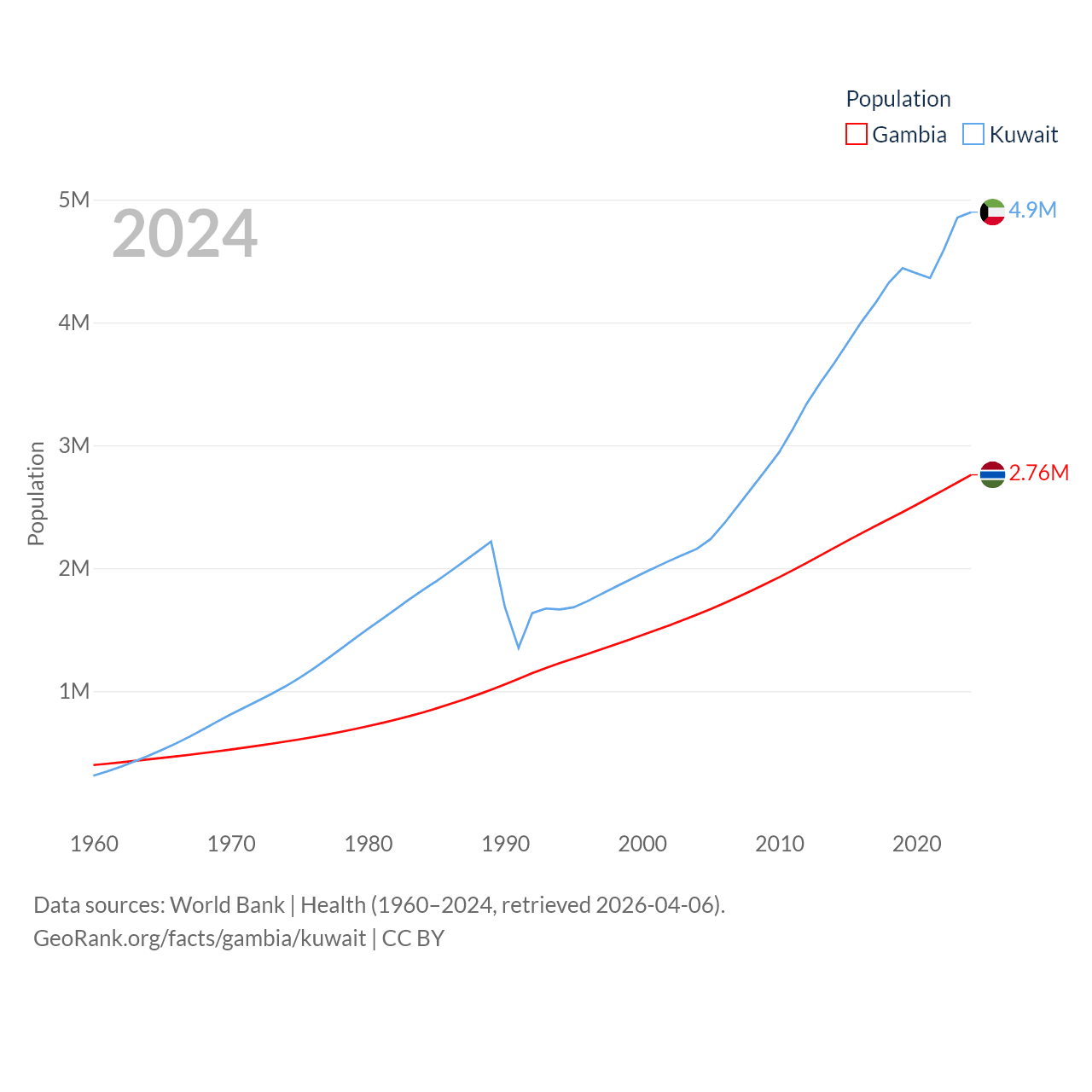 The Gambia has a population of 2.76M (ranked 140/197), compared with 4.9M in Kuwait (ranked 127/197). The Gambia's land area is 3,907 sq mi versus 6,880 sq mi for Kuwait (ranked 161st vs. 153rd).