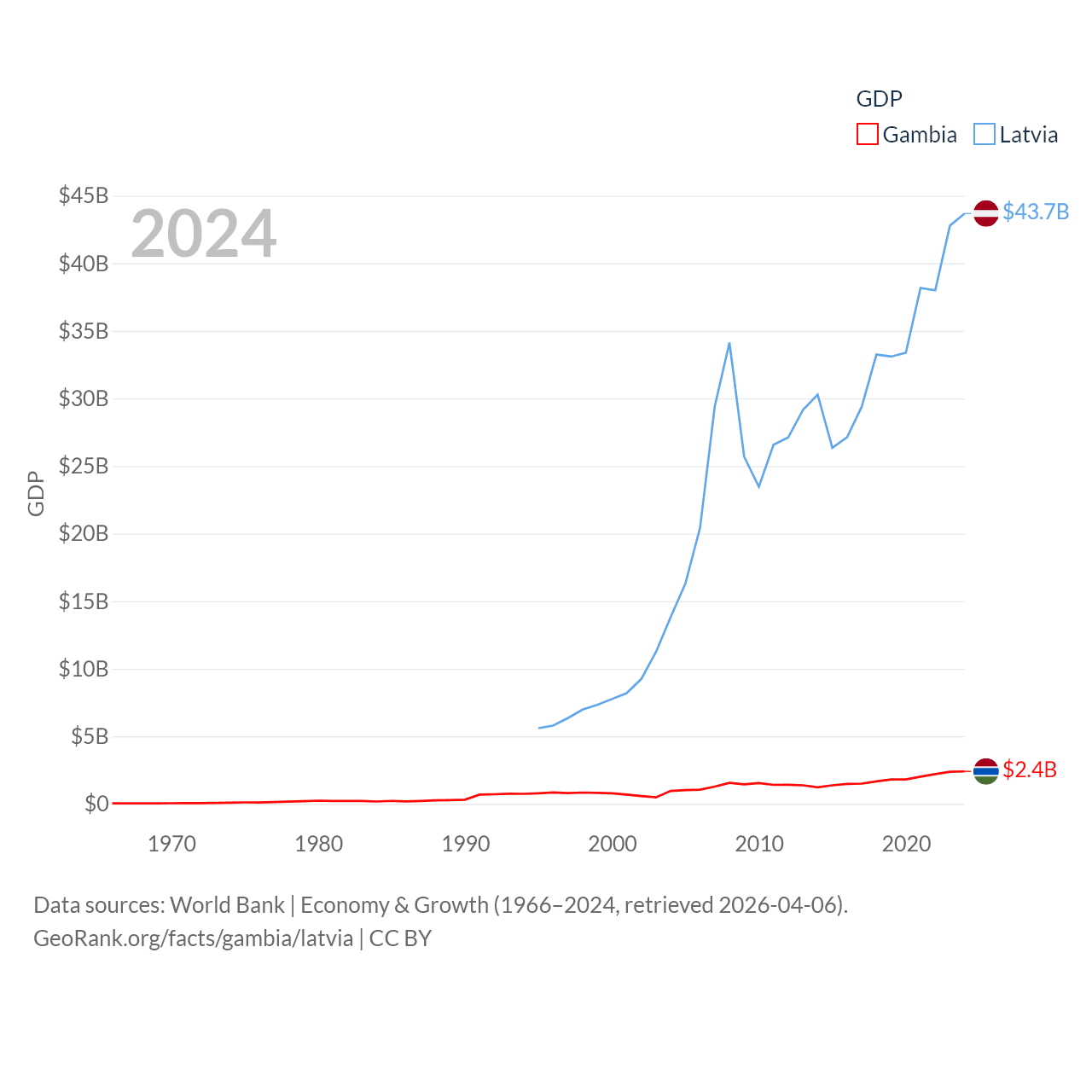 By GDP, The Gambia ranks 174/197 ($2.4B) and Latvia ranks 99/197 ($43.7B). By GDP per capita, The Gambia ranks 183/197 ($871), while Latvia ranks 54/197 ($23,409).