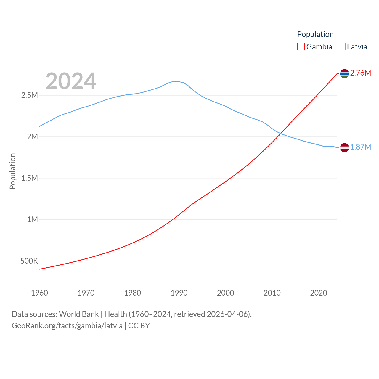 The Gambia has a population of 2.76M (ranked 140/197), compared with 1.87M in Latvia (ranked 149/197). The Gambia's land area is 3,907 sq mi versus 24,027 sq mi for Latvia (ranked 161st vs. 121st).