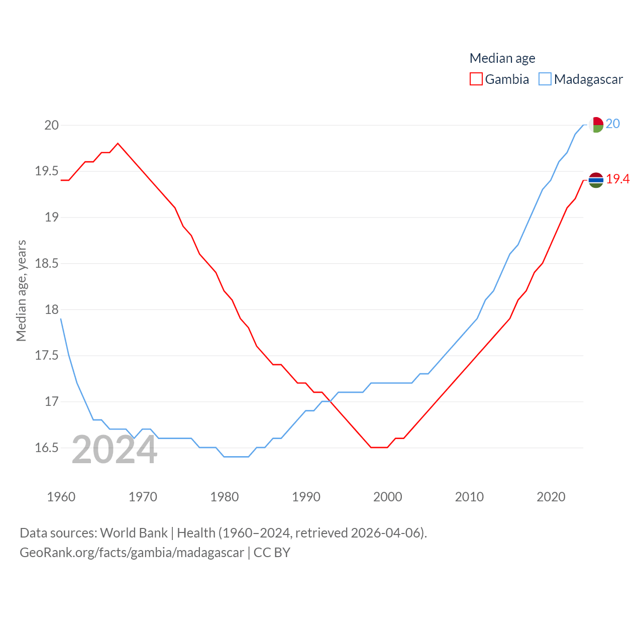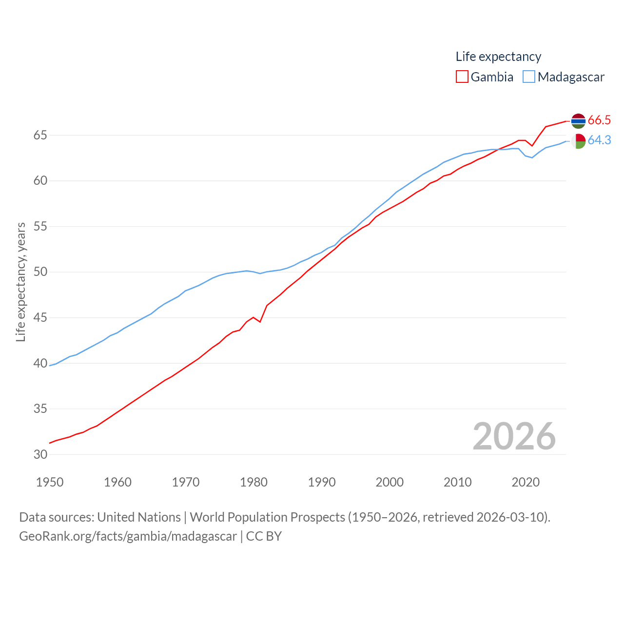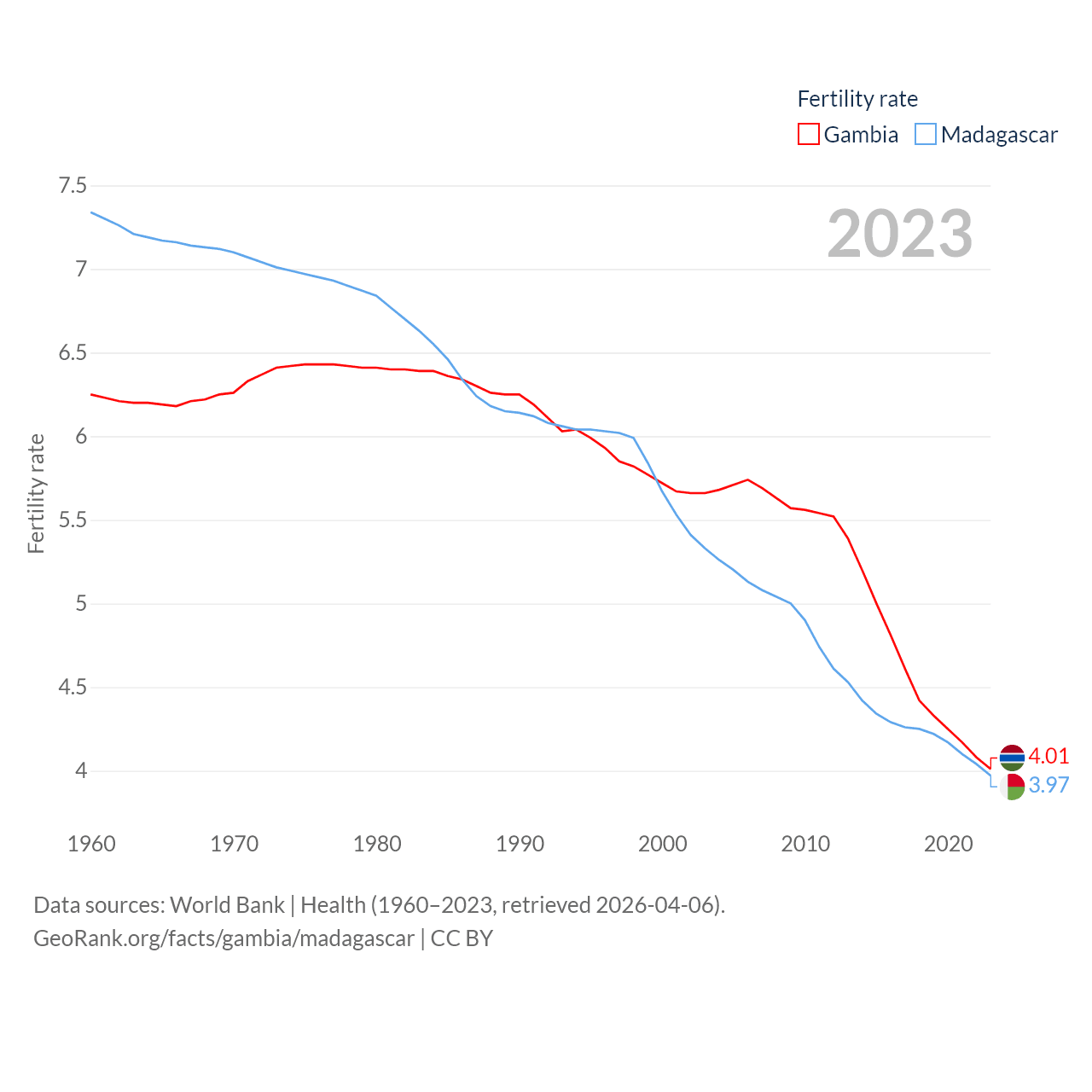 The Gambia has a population of 2.76M (ranked 140/197), compared with 32M in Madagascar (ranked 49/197). The Gambia's land area is 3,907 sq mi versus 224,634 sq mi for Madagascar (ranked 161st vs. 44th).