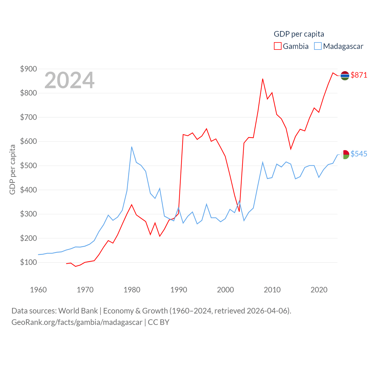 By GDP, The Gambia ranks 174/197 ($2.4B) and Madagascar ranks 136/197 ($17.4B). By GDP per capita, The Gambia ranks 183/197 ($871), while Madagascar ranks 193/197 ($545).