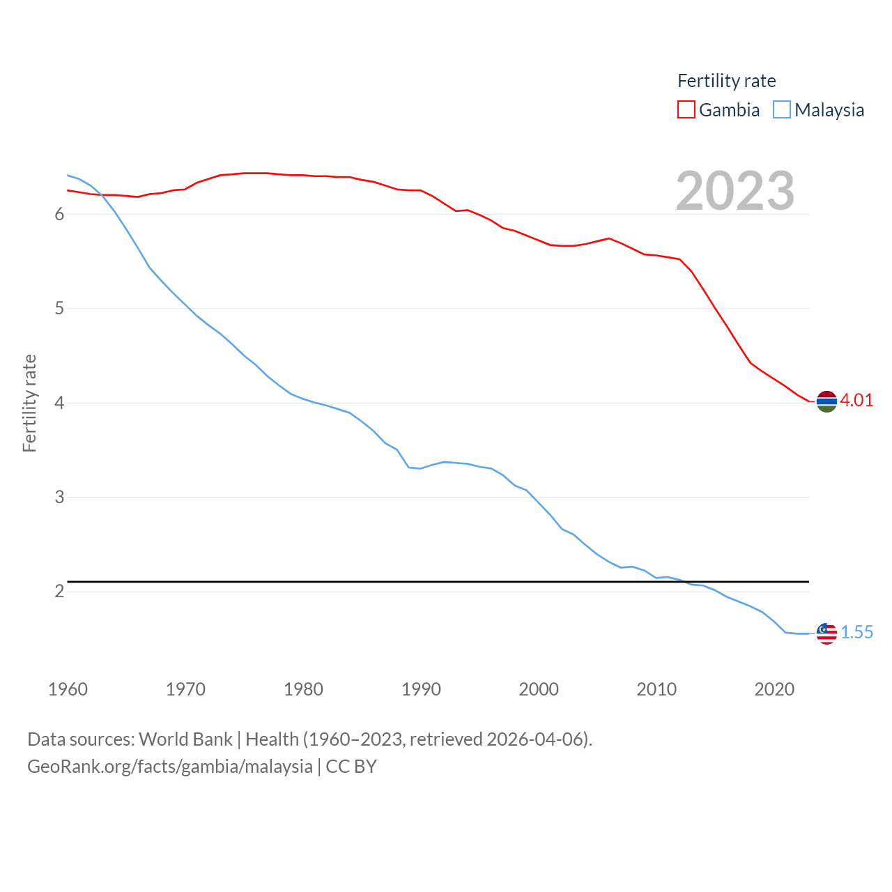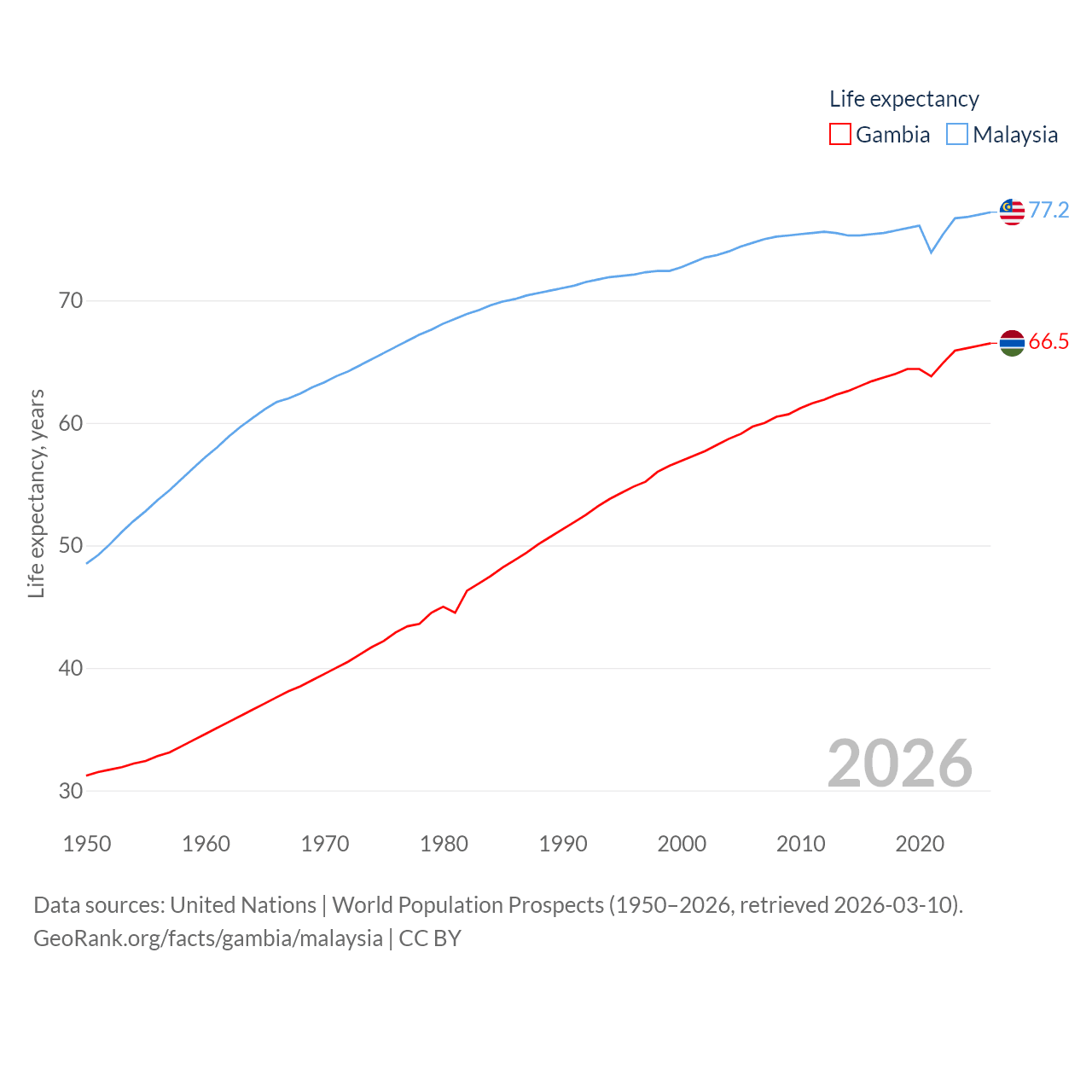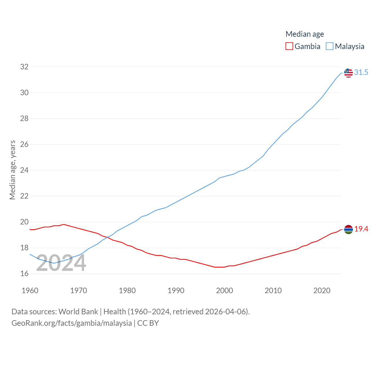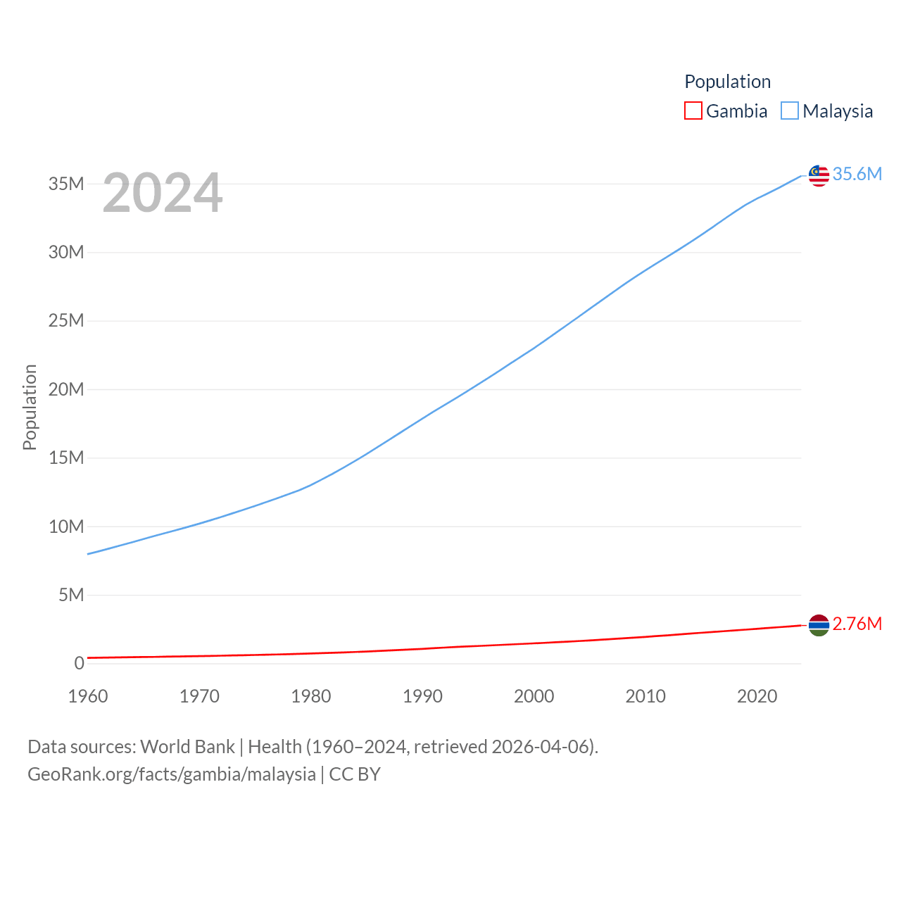 The Gambia has a population of 2.76M (ranked 140/197), compared with 35.6M in Malaysia (ranked 44/197). The Gambia's land area is 3,907 sq mi versus 126,854 sq mi for Malaysia (ranked 161st vs. 65th).