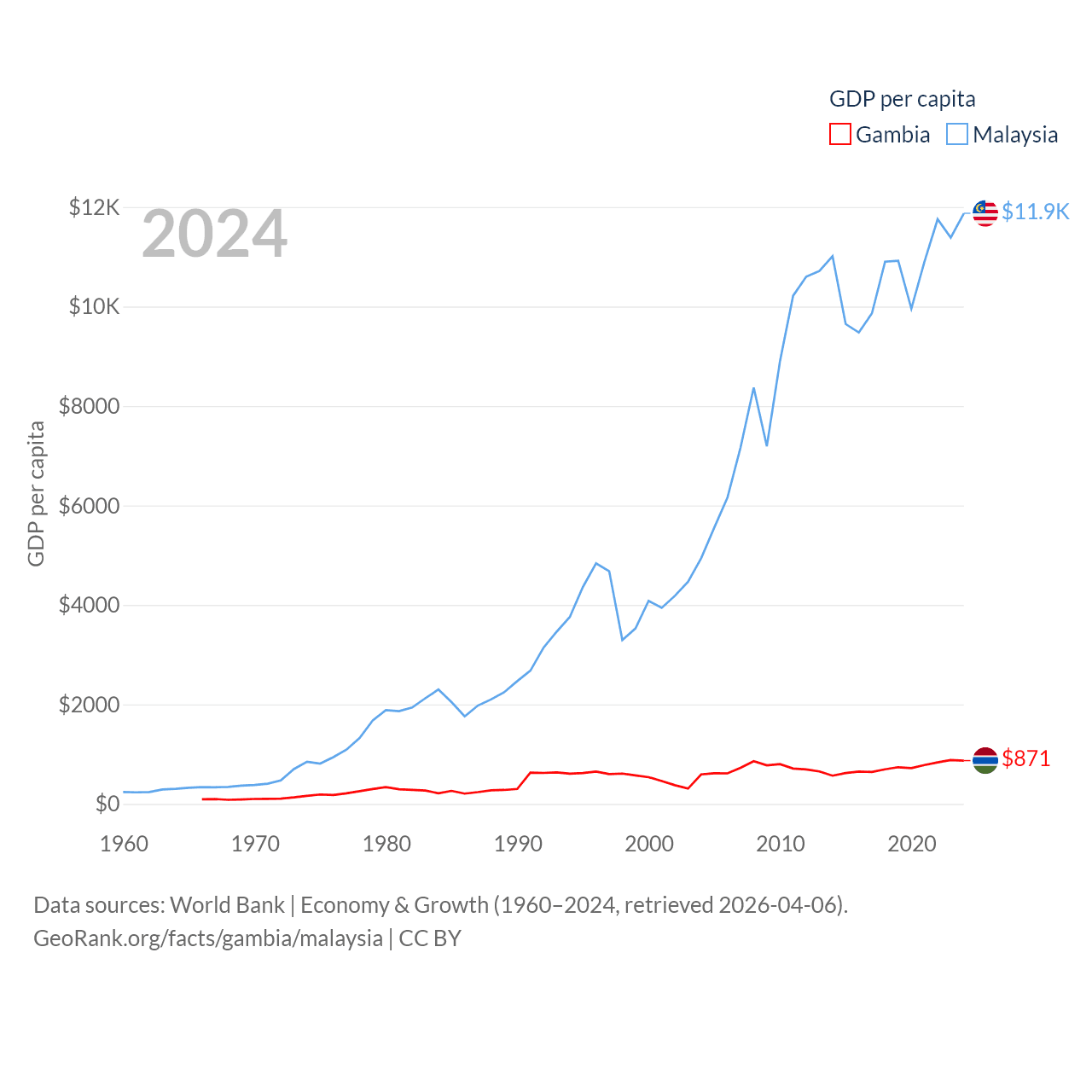 By GDP, The Gambia ranks 174/197 ($2.4B) and Malaysia ranks 38/197 ($422B). By GDP per capita, The Gambia ranks 183/197 ($871), while Malaysia ranks 79/197 ($11,874).
