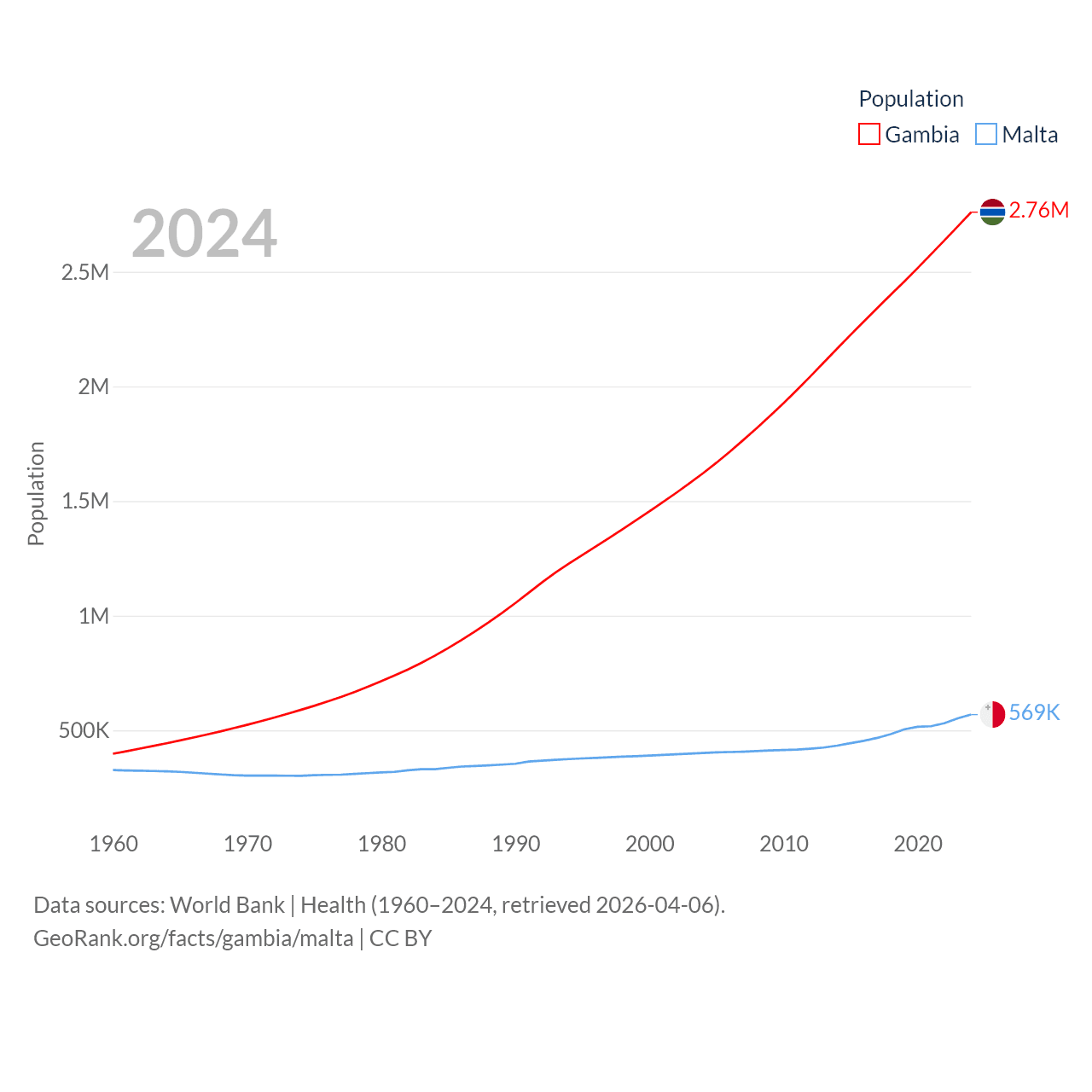 The Gambia has a population of 2.76M (ranked 140/197), compared with 569K in Malta (ranked 167/197). The Gambia's land area is 3,907 sq mi versus 123.6 sq mi for Malta (ranked 161st vs. 187th).