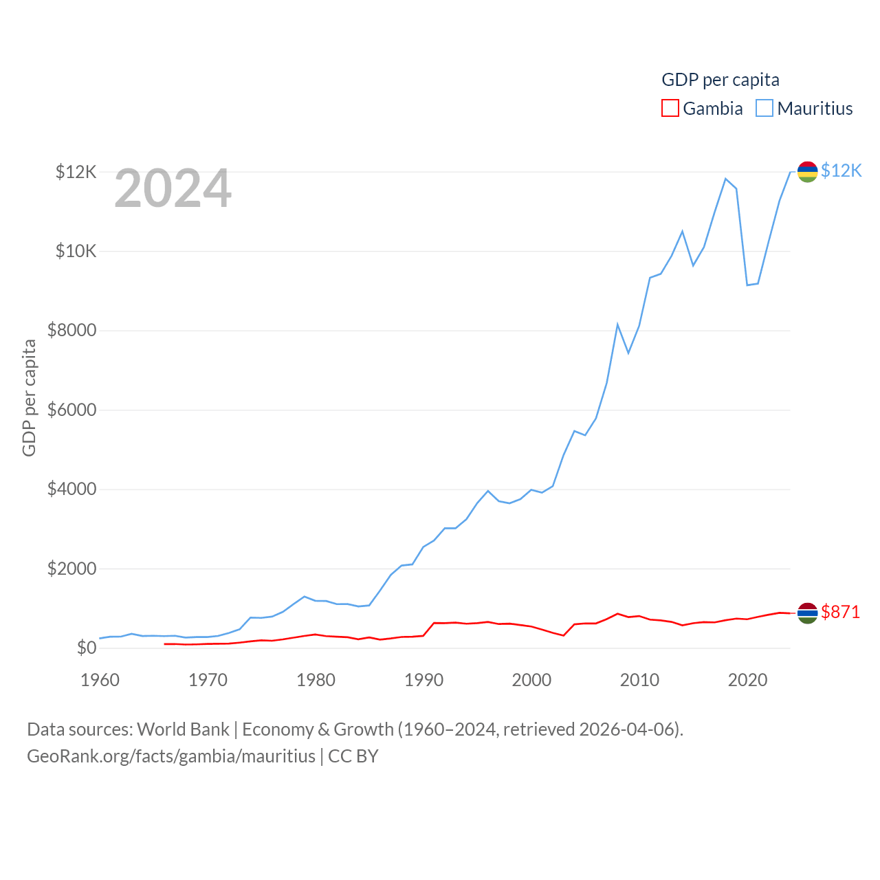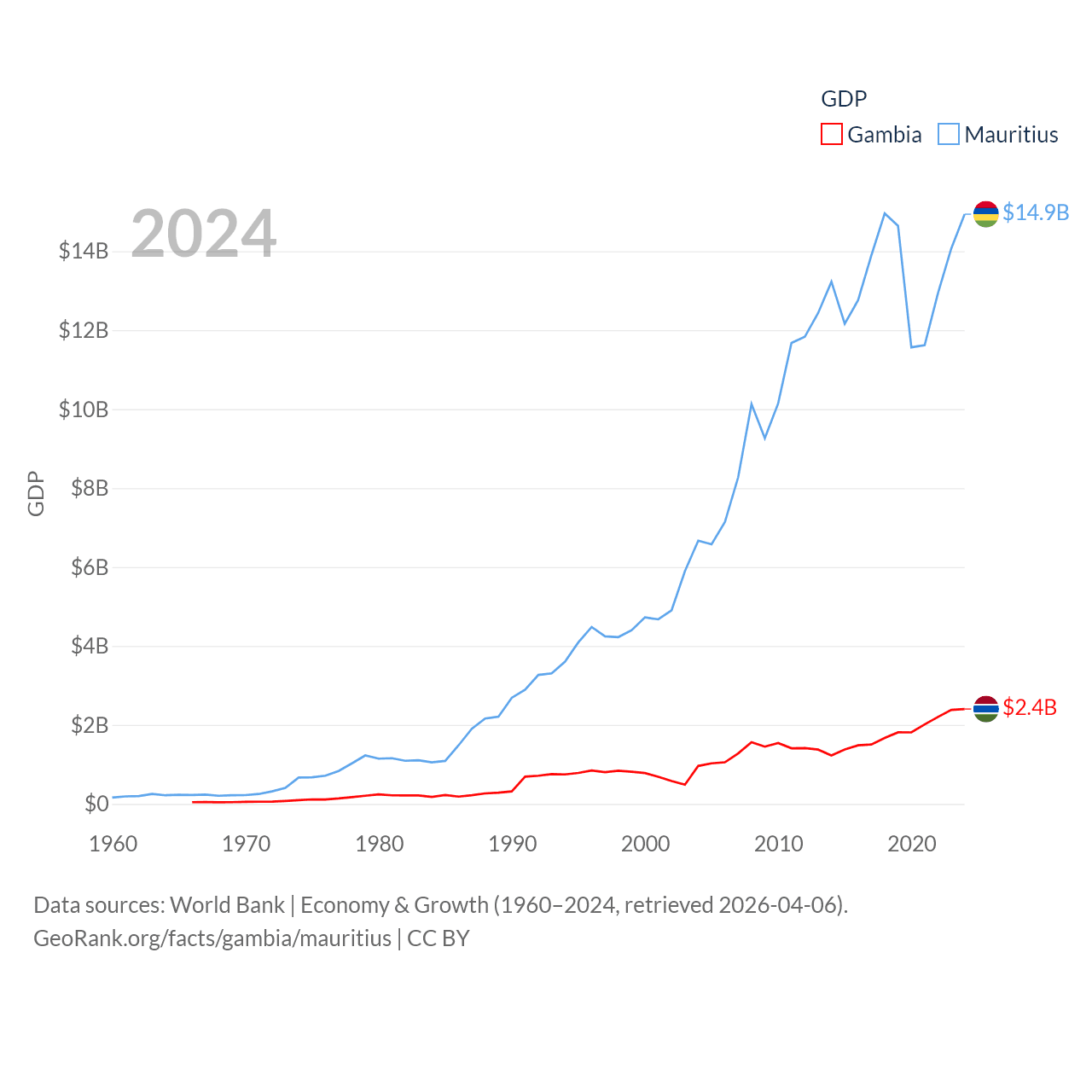 By GDP, The Gambia ranks 174/197 ($2.4B) and Mauritius ranks 143/197 ($14.9B). By GDP per capita, The Gambia ranks 183/197 ($871), while Mauritius ranks 78/197 ($11,991).