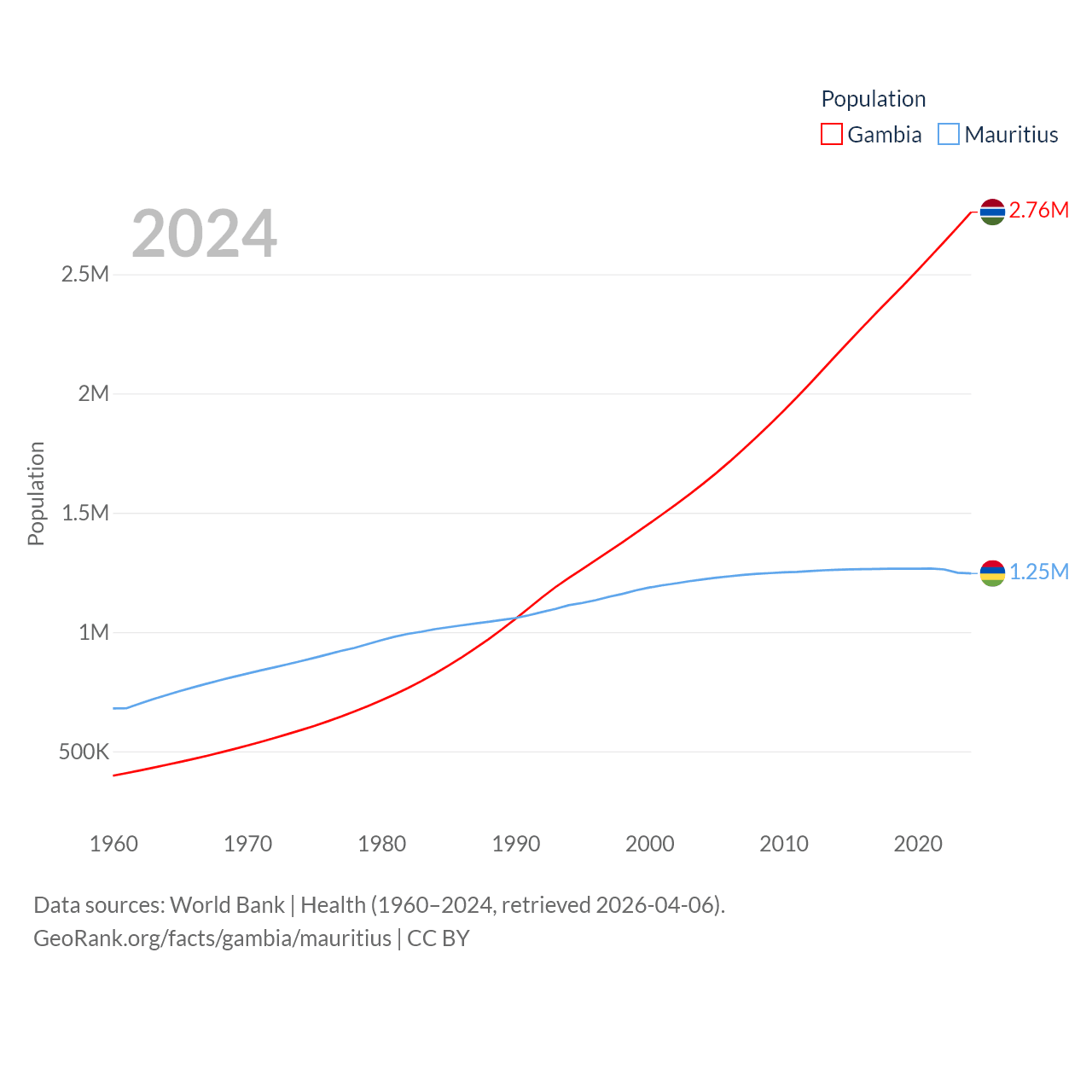 The Gambia has a population of 2.76M (ranked 140/197), compared with 1.25M in Mauritius (ranked 156/197). The Gambia's land area is 3,907 sq mi versus 771 sq mi for Mauritius (ranked 161st vs. 170th).
